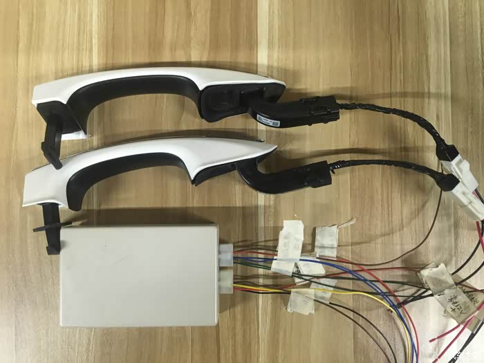 新蒙迪欧触摸门把手目前是国内一些一键启动厂家都不愿意去开发的一个项目,技术难度大成本高,安装复杂售后问题多。但是我个人对触摸门把手还是存在一种情结,非常荣幸受车友的追捧要求我研究一下触摸门把手,今天特地把新蒙迪欧自制触摸门把手测试版与大家分享,改装大师们请少拍砖,我只是业余的。经过大半个月的各种天气状况下测试,目前小雨和中雨天都不会出现触摸自动感应的问题出现,大雨天没有遇到过所以没有准确的意见可以分享,不想误导。其实对于1.5时尚版的车友这个触摸门把手后期改装成本低,不用换新的门把手直接可以使用原车门把手,改好以后如果想贴电镀的不锈钢亮条就直接贴上功能一点也没有影响,我个人还是喜欢高配的那种门碗拉手有一个高配的预留口关锁直接按那个孔就可以了,方便好找。我在门把手上把原车的关闭所有窗户功能合并到门把手上,只要关锁以后再按住触摸门把手关锁3秒就可以实现关闭整车门窗,也可以按关锁的时候不松手3秒。个人感觉总体来说还可以,毕竟小成本大功能**者的最爱。。。。下面简单发一些图片这个是我福建的一个车友阿弟要求我帮他做得与大家分享。。。。