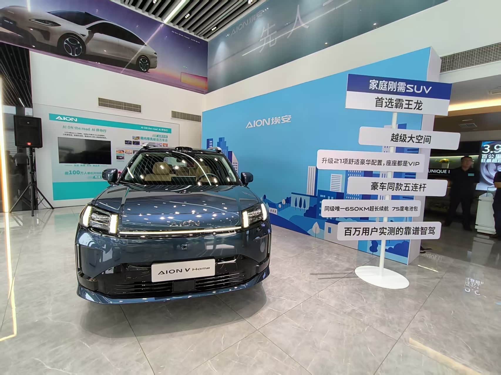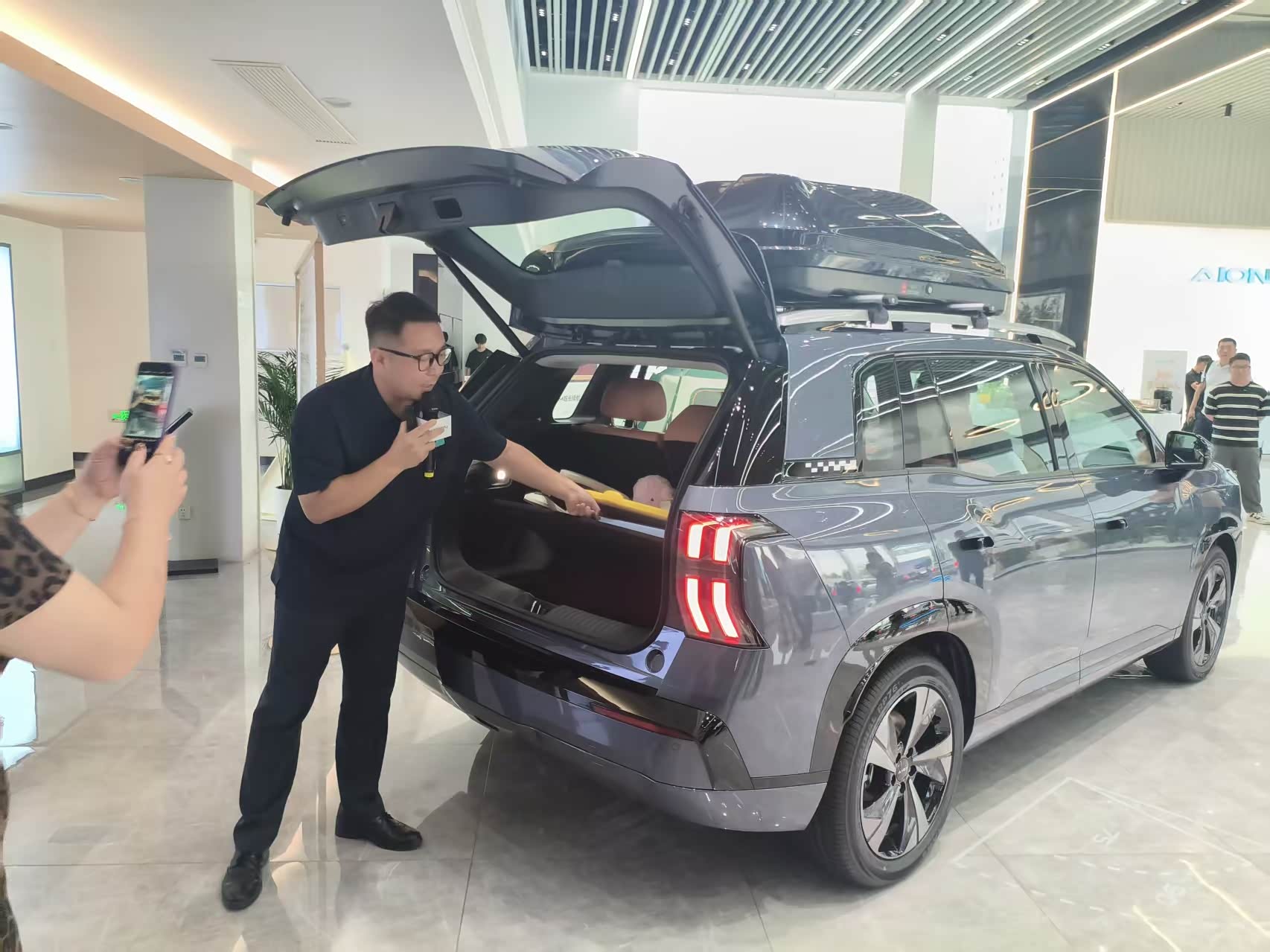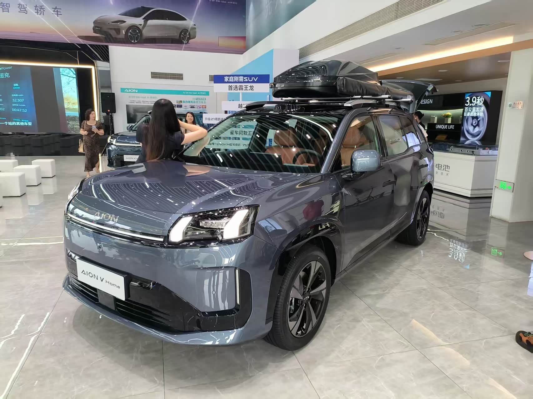 不久,本次活动的主角埃安霸王龙家庭版(AION V Home)出现在我们的视野里,店内的销售人员就带着我们围着新车转了起来,特意重点说的几个特点,比如越级B级空间,主副驾按摩椅,冷冻、冷藏、制热三模式冰箱,豪车级五连杆(广汽 + 保时捷联合调校);75 度电池长续航,3C 快充,V2G逆向放电;激光雷达智驾,全场景泊车,弹匣电池,高强度车身。配置升级这么多,很适合家庭用,刚需SUV 首选呀!