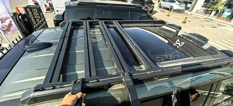 猛士M817车身侧面从A柱贯穿至D柱的笔直棱线,搭配外扩式金属轮拱,视觉上宽体效果明显。标配电动伸缩侧踏板,车顶配备可拆卸式无人机机库和承重100kg的行李架,这个行李架是相当厚实,并且呢实用度非常高,这种厚重感给人以更好的信心,并且当场还试验了一下空悬,最高高度可以升至2米1整个高度非常的霸气且威武,居高临下的感觉就这么来了!