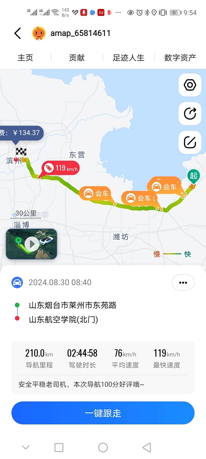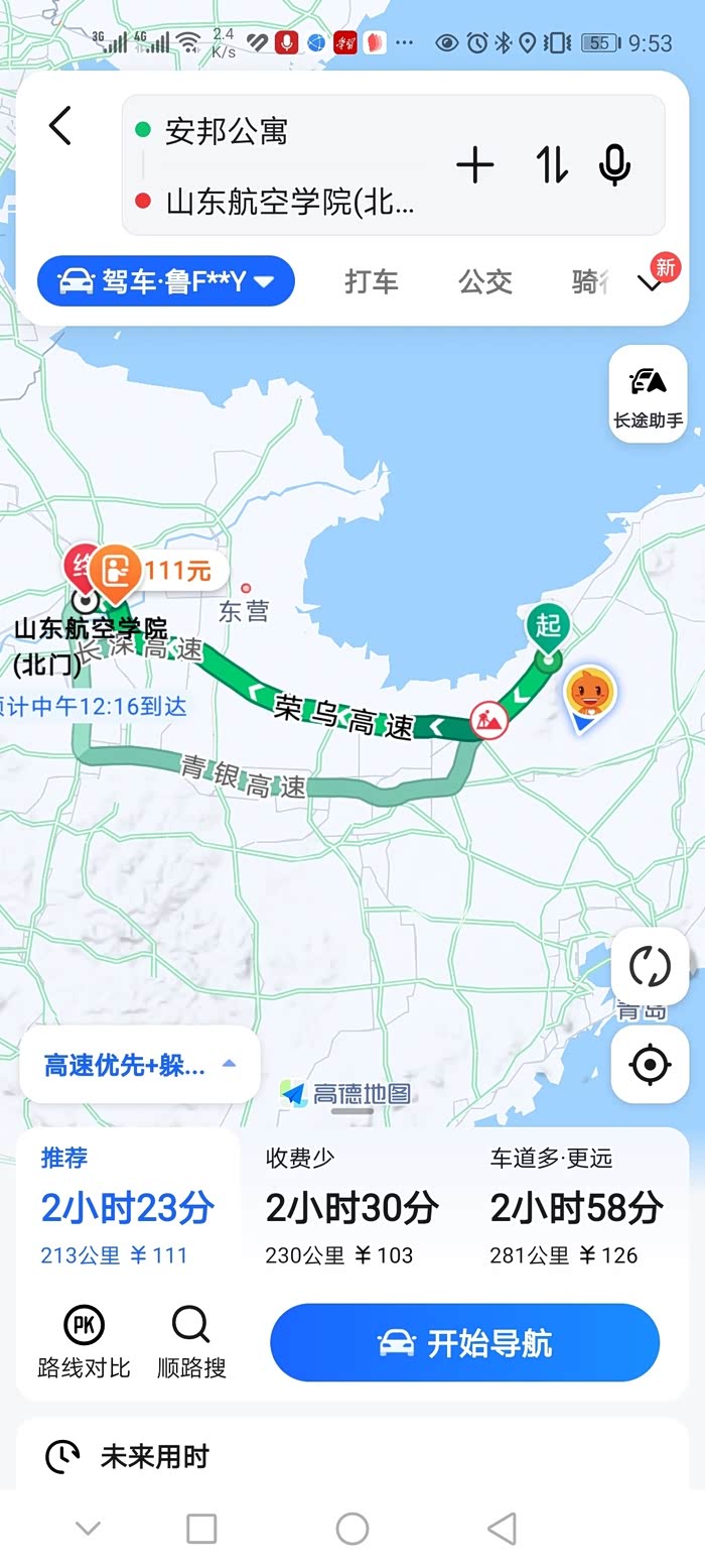 因为是第一次去滨州路况不熟悉,还是通过高德导航为我出行规划路线,通过高德导航到达山东航空学院大约的距离210公里,耗用时长大约2.5小时,一路上我负责开车,爱人和女儿就是尊贵的乘客,一路上有说有笑,听着车子里放着动感的音乐,爱人和女儿则是不停的互相交流着上大学的美好憧憬和美好的向往,嘱咐女儿要在大学里好好学习,将来准备进一步考研,我不时的也插上两嘴,叮嘱女儿要好好处理好大学学习和生活,为将来有一个更好的未来打好基础,沿途中让我觉得惊讶的莫过于雄伟的黄河大桥,还有路边那些开采石油的“磕头虫”石油钻井平台,就这样不知不觉两个多小时过去了,我们就顺利到达了山东航空学院了,因为是第二天报道,所以知道了学校的位置,我们就赶往我们提前预订的宾馆入住了。