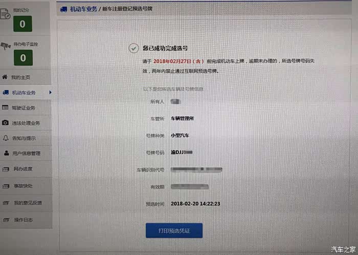 因为提车时间接近春节,节前上户肯定来不及了,就一直拖在了节后。春节最后几天,和销售电话沟通了上户时间,上班后立马安排,心里有底了。随后和老婆在网上直接把号选了。本来之前一直想抱着中彩票的心态到上户现场去摇豹子号,毕竟是我们都是渝中区长大的娃儿,对于渝A的牌子更是有种莫名的亲切感。但是后打听到说现在的号真的拼运气,而且选择时间只有180秒,50选1,我估计还没选好就被看得眼花缭乱了。所以好在我到车管所的网站看了看新发布的号牌,虽然是渝D开头,但是JJ确实我们想要的,而且网上选号在时间上更充足,只有我们可以自编自己喜欢的数字。时刻要打有准备的仗,这也是我一直所倡导的。随即把车辆的基本资料录入进去后,直接根据自己喜欢的数字自编号牌。