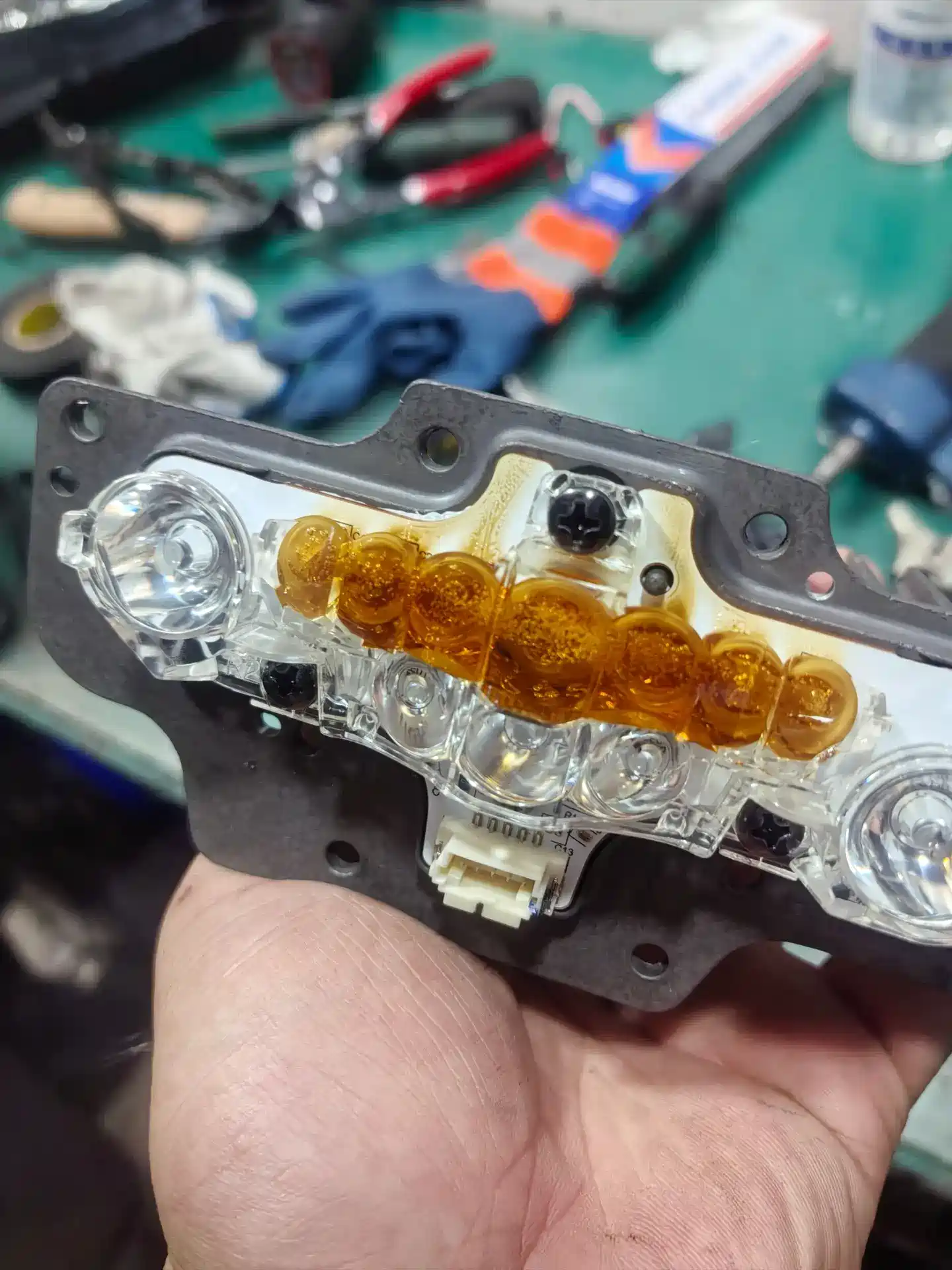 除雾完成后就进入密封环节,这是防止水雾复发的关键。师傅先把灯壳凹槽里的旧密封胶彻底清理干净,确保密封面没有灰尘和杂质,然后选用耐高温的硅胶密封胶,沿着凹槽均匀涂抹,厚度保持一致,没有出现断点或堆积。接着将灯罩准确对齐灯壳,用力按压贴合,挤出多余的密封胶后,用干净抹布及时擦除干净 。为了确保密封效果,师傅还特意检查了大灯后盖的防尘罩,发现有点老化,顺便帮我更换了新的,说这能进一步阻挡水汽侵入。最后把大灯总成装回车上,连接好线路,打开大灯测试,远近光都能正常点亮,照明角度也没偏差。