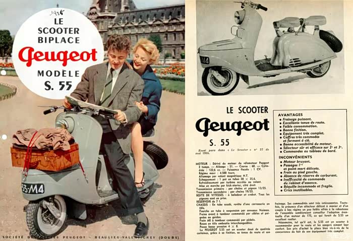 1953年,从二战硝烟中苏醒过来的法国标致推出了一款国民用车——S55,这款踏板车采用全钢钢板外壳作为车身,同时作为本车的覆盖件,类似于现在汽车的承载式车身。