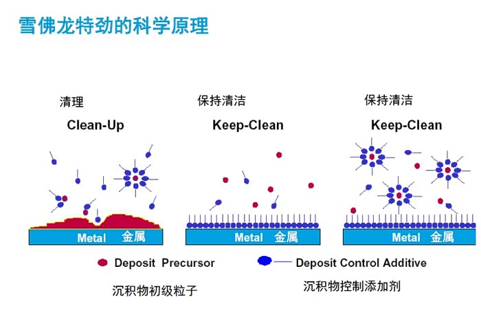 燃油添加剂的工作原理就是清理这些沉淀物的原理,之前看过特劲的一份相关资料,它用一张图表示出燃油添加剂的工作原理: