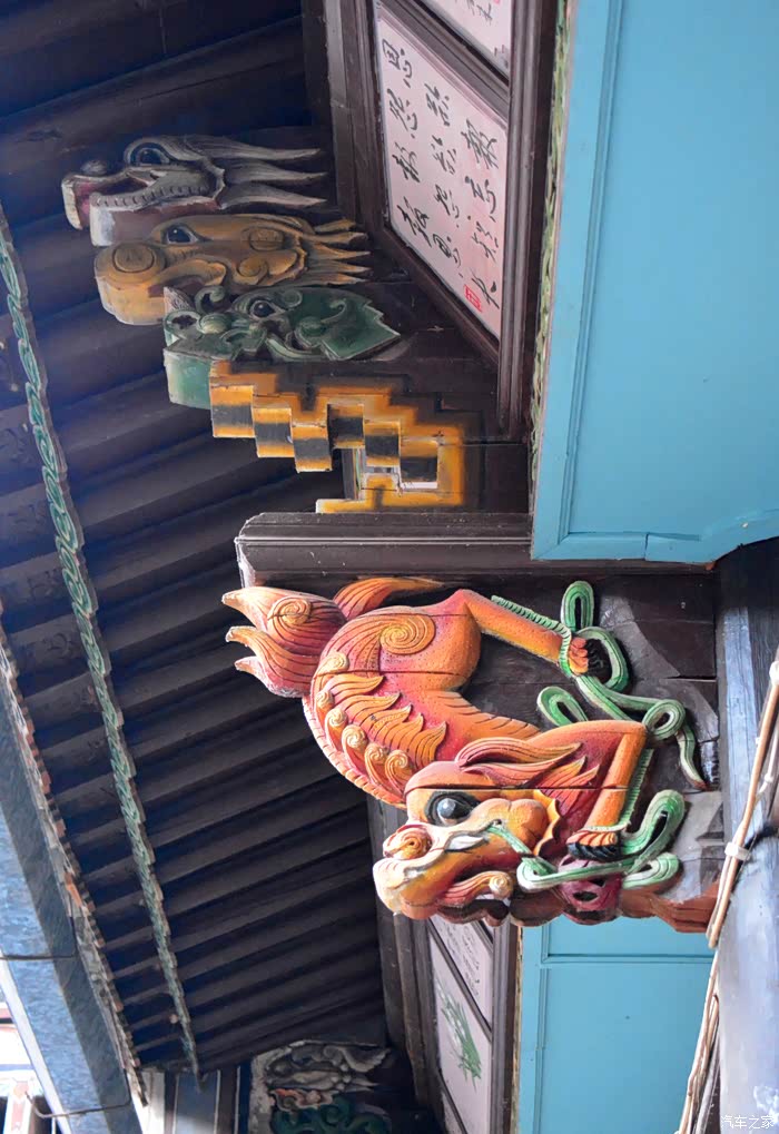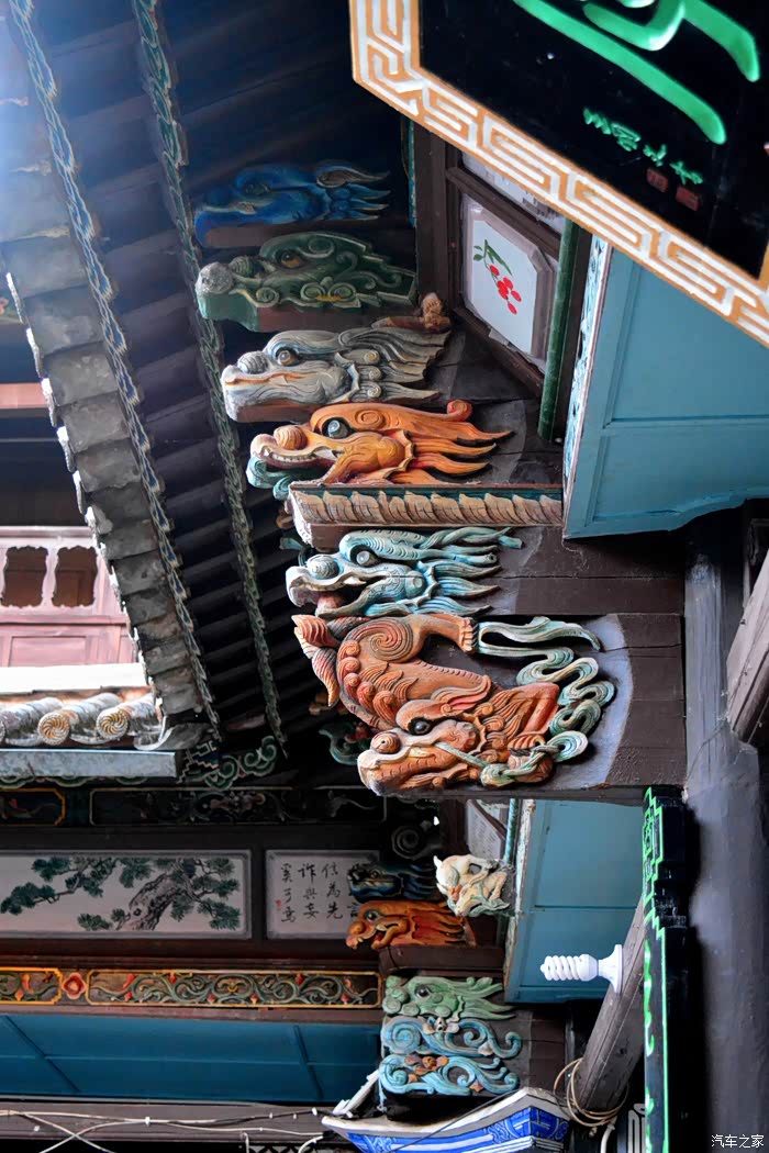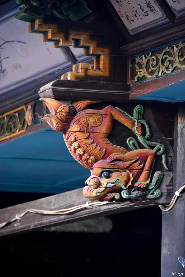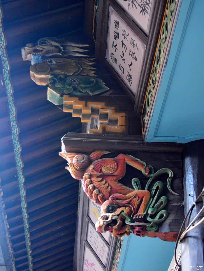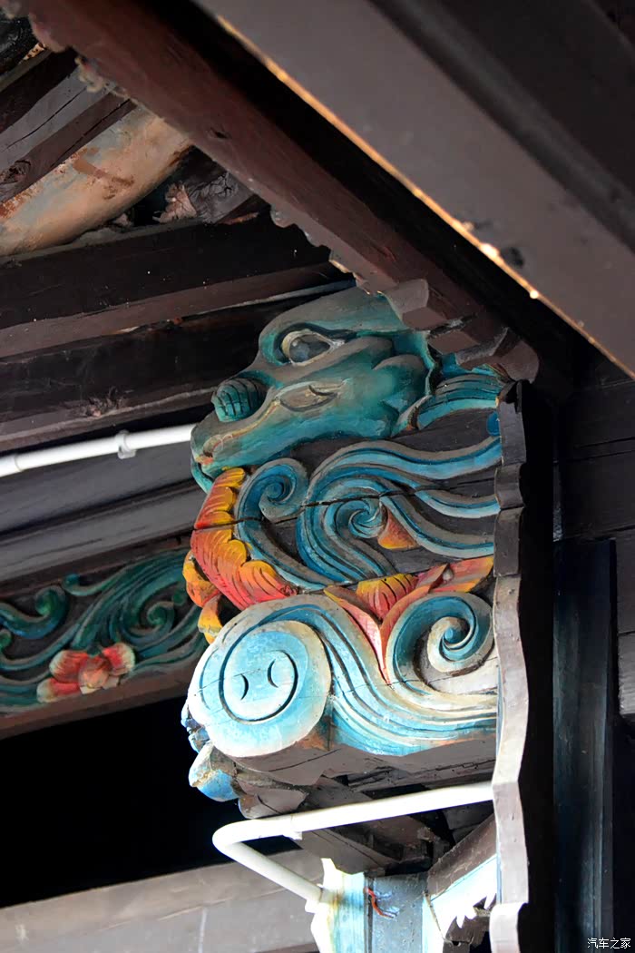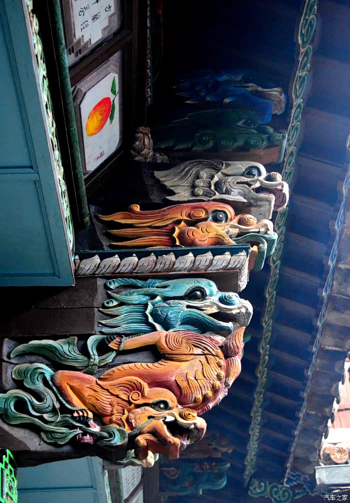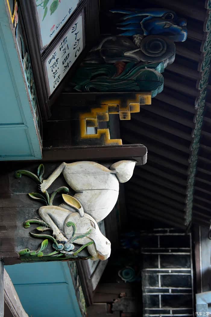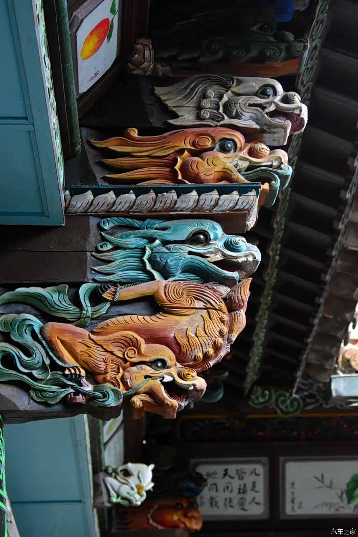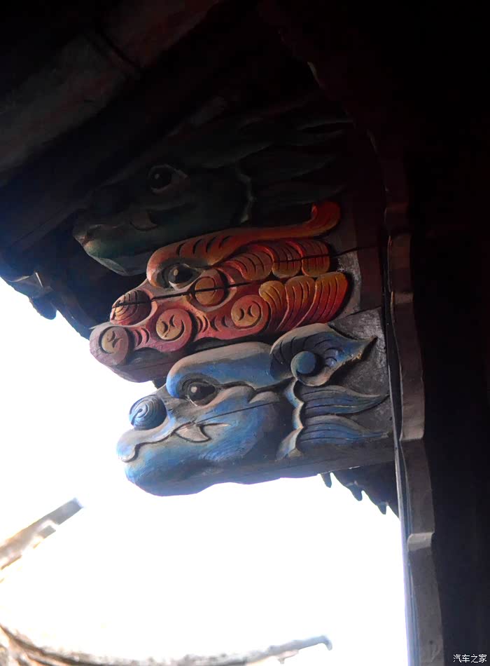 只抬头看时,你会觉这些木雕的梁头,柱头上雕刻的神兽得都一样,但只要你再仔细看,每一组都不同、雕刻的相当精致、色彩很漂亮、一般圆雕作品上色大多是单色,马如骐大院建筑的这些梁头、柱头上雕刻的神兽、栩栩如生、惟妙惟肖、色彩用得很艳丽、而且还运用了原色的过度和渐变、使这些木雕神兽更具立体感、层次感、这个是在别的地方没见过的。