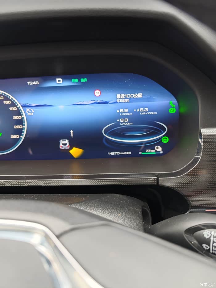 2. 混动标准模式:在高速上行驶,如果出发时满电,行驶330公里,平均车速68,电耗9.2度/百公里,平均油耗8.3升/百公里。