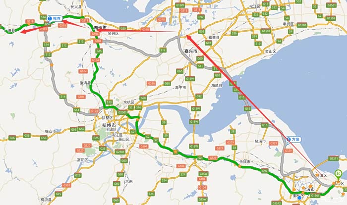 比较理想的一条线是走杭州湾跨海大桥;也就是途中红色箭头标注的路线。