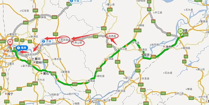 一条是安庆后,往上走一点, 到安徽的岳西县----》英山县----》罗田县----》武汉 这条线较短,(下面配图中红色箭头标注的路线。)而且会经过安徽最长的隧道,在岳武高速上(安徽岳西到武汉),明堂山隧道长度为7.78公里,居全国前列。