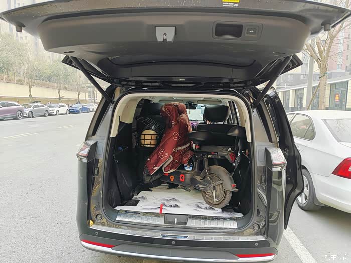 果断收起三排座椅,和同事抬起电动车往后备箱放。惊喜了,放进去了,而且空间绰绰有余。