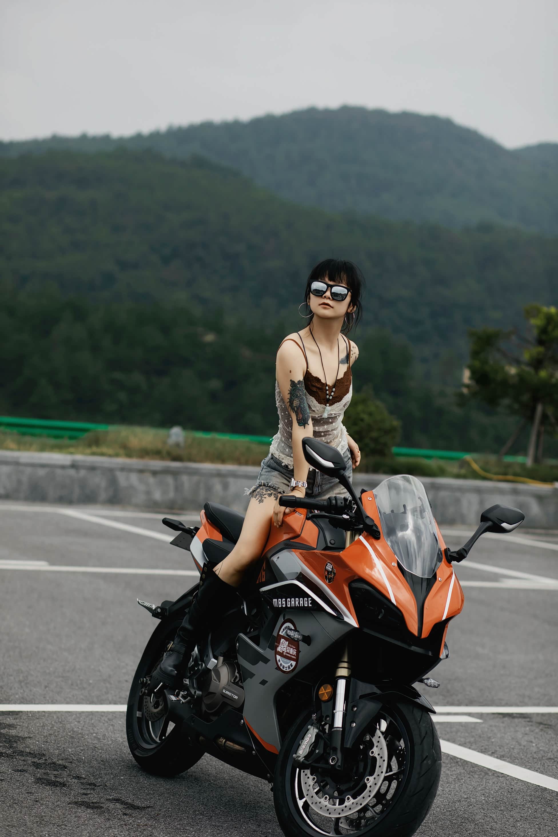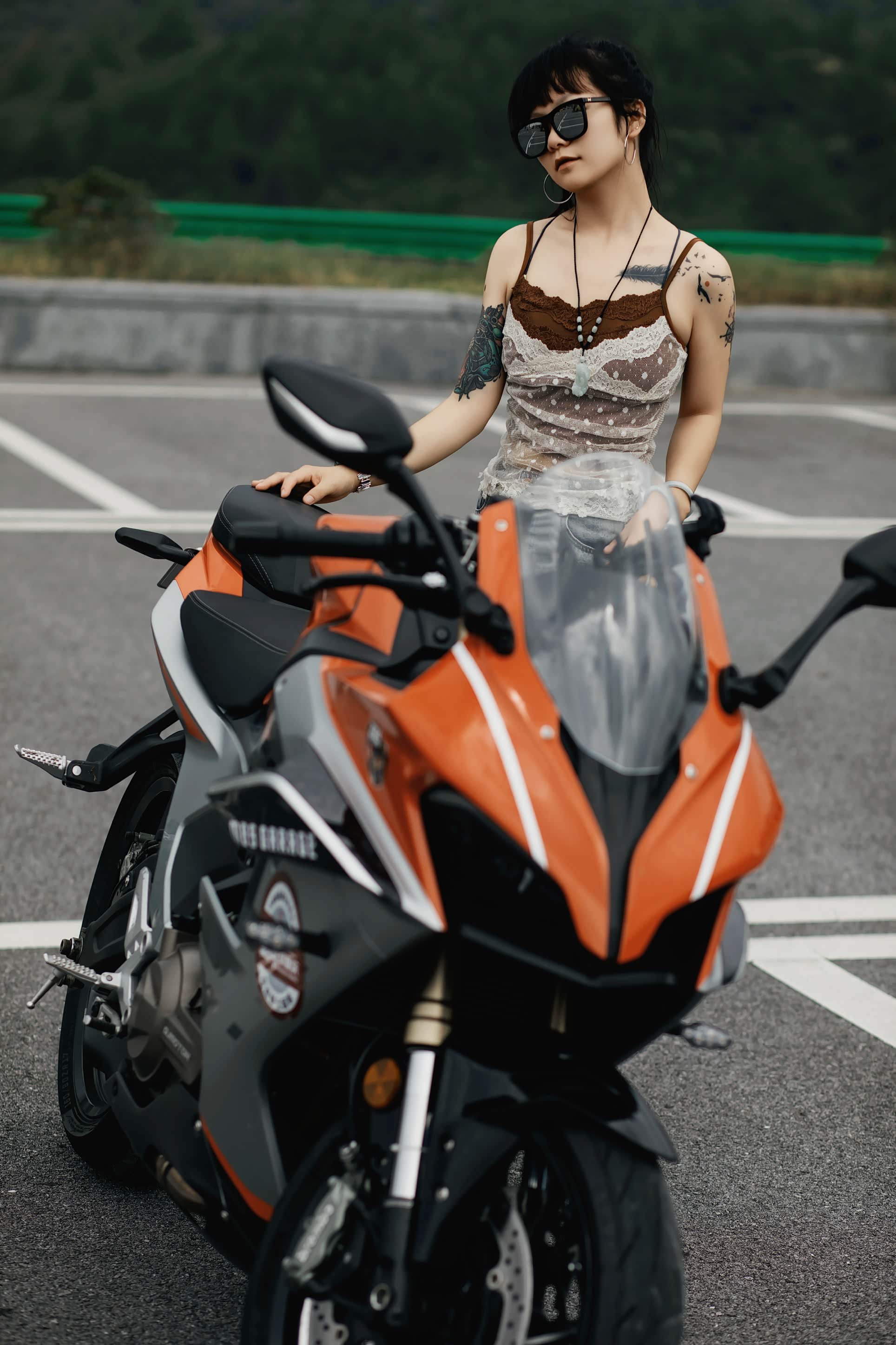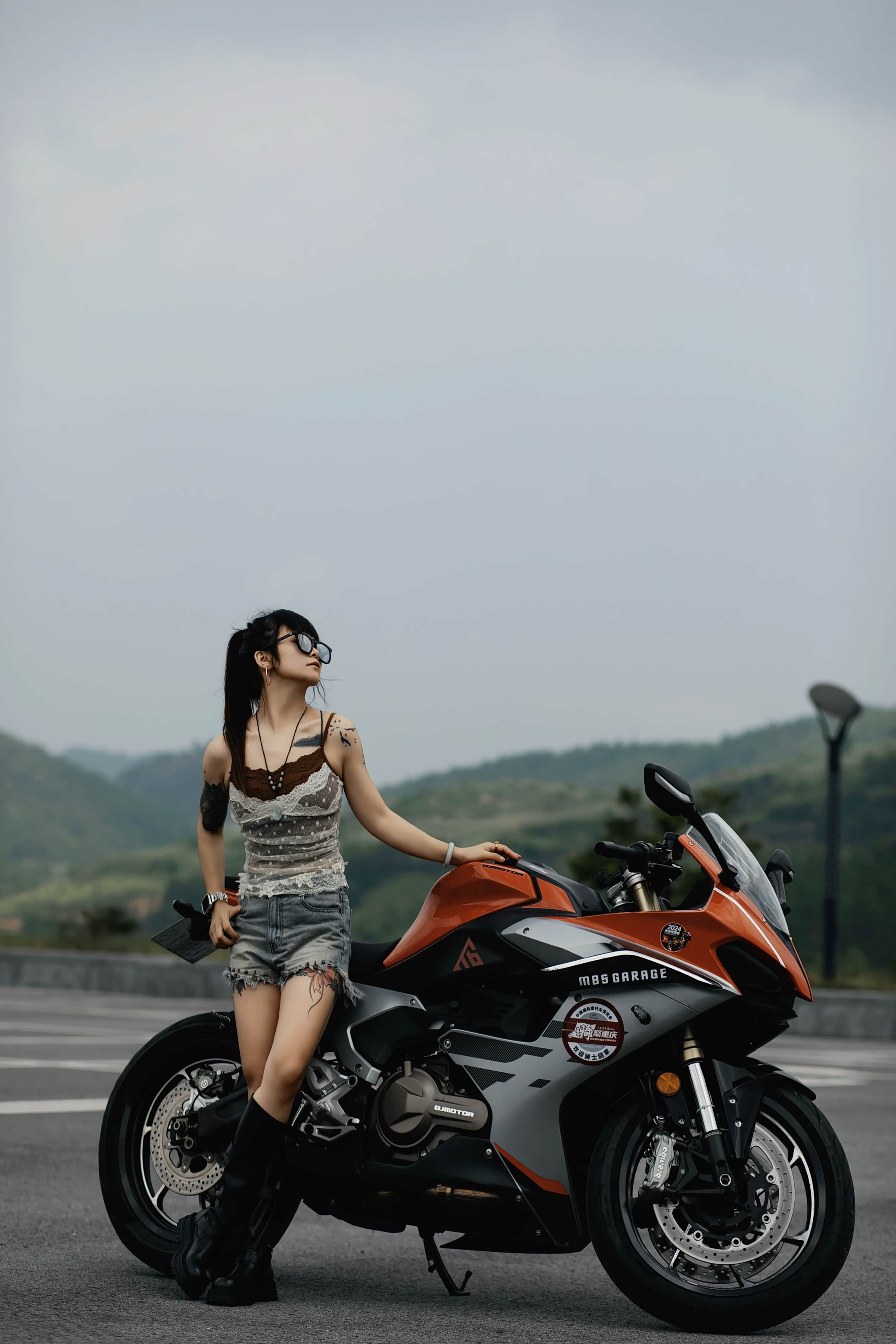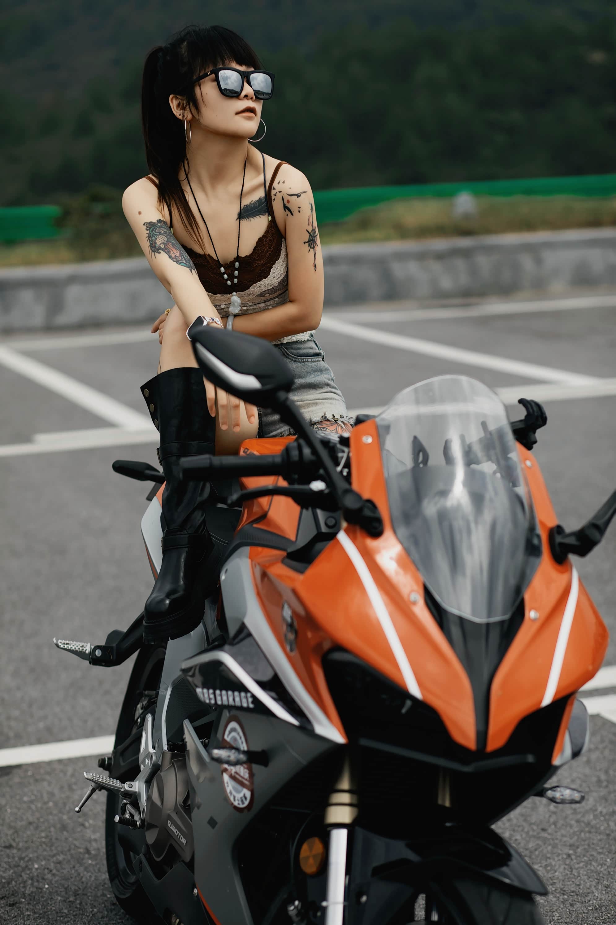 引擎轰鸣撕裂空气,她甩了甩被风掀起的长发,跨上重机的瞬间,红唇勾起的弧度比排气管的热浪更灼人——这不是谁的副驾,是她自己掌控的旷野。