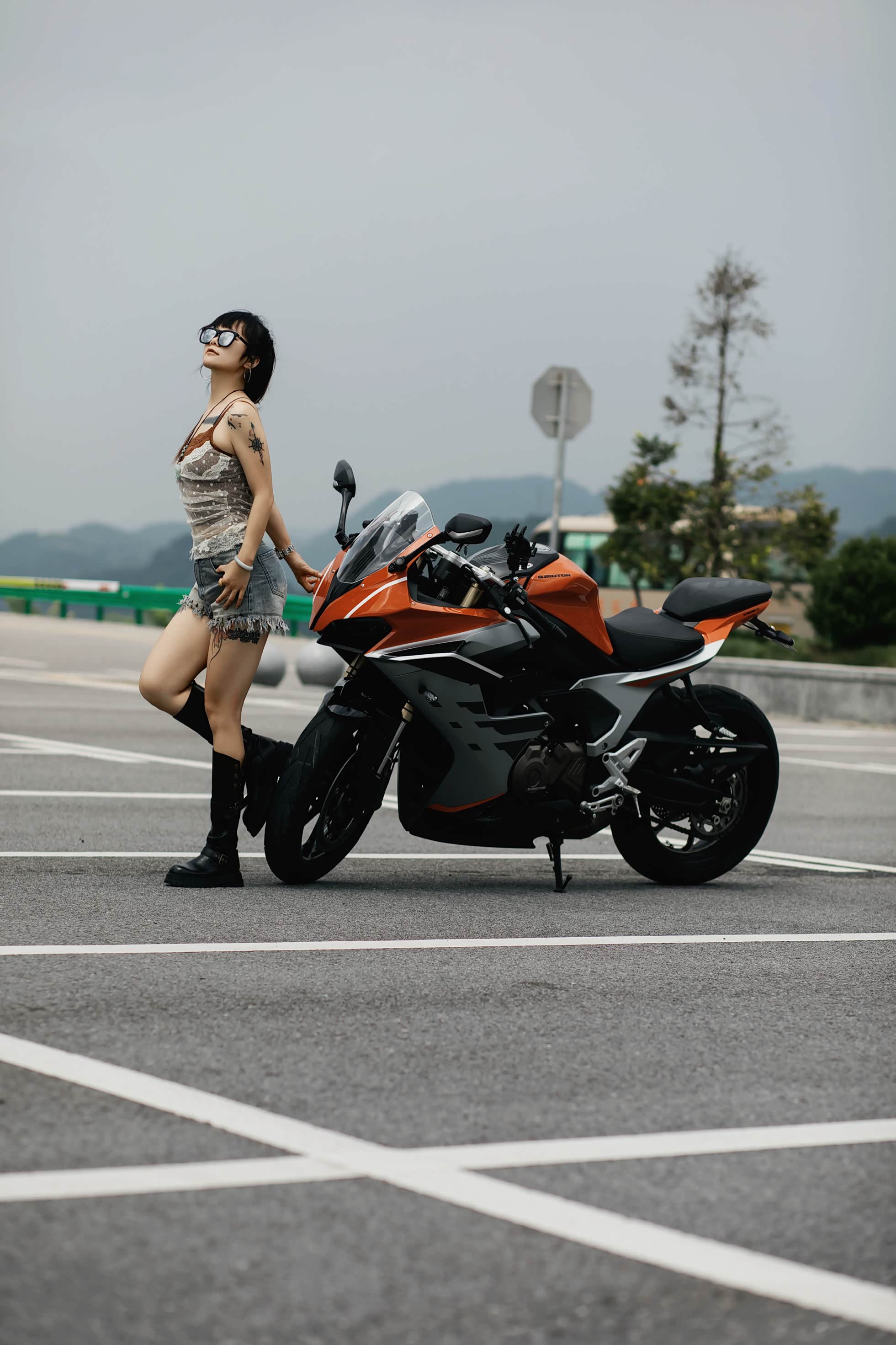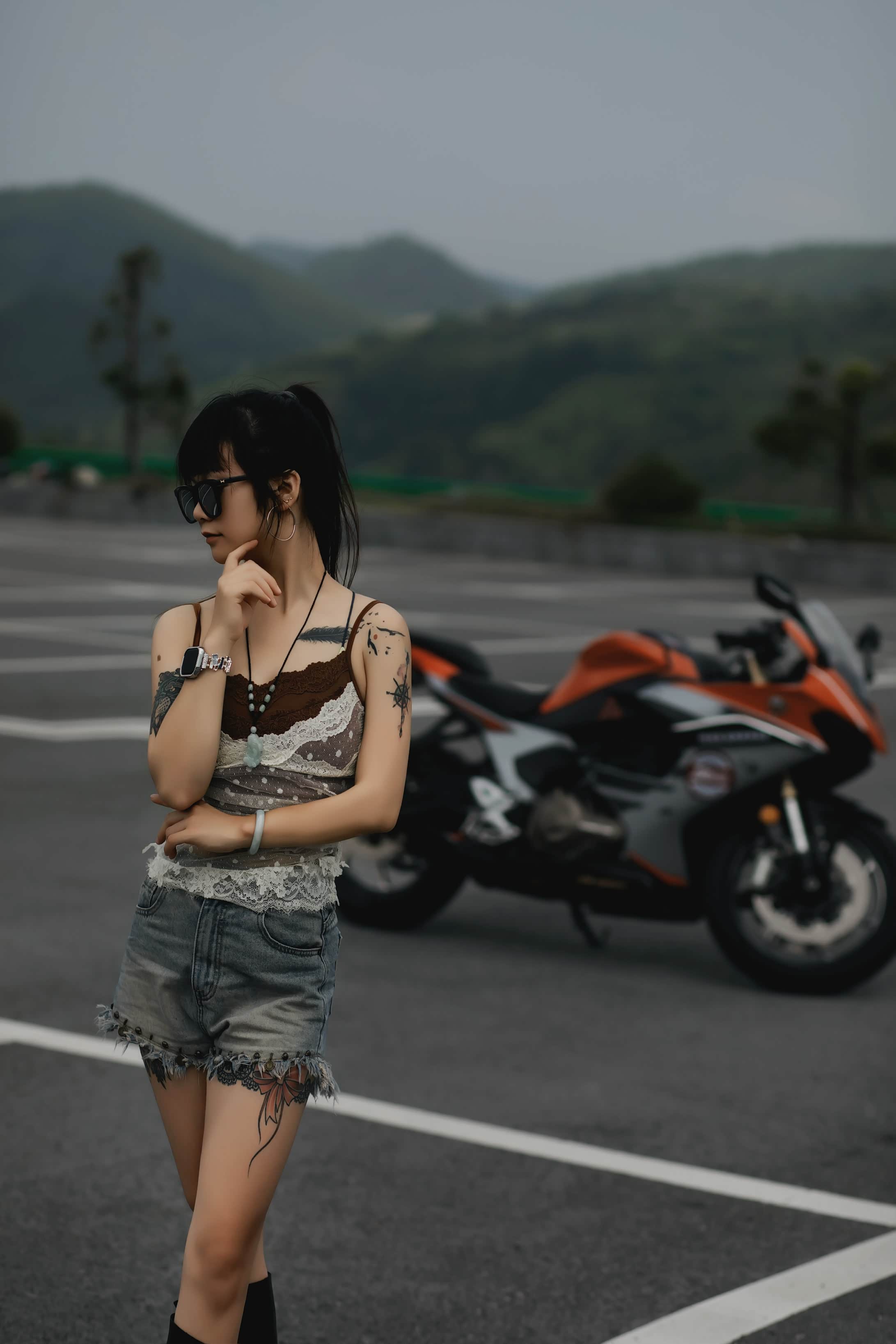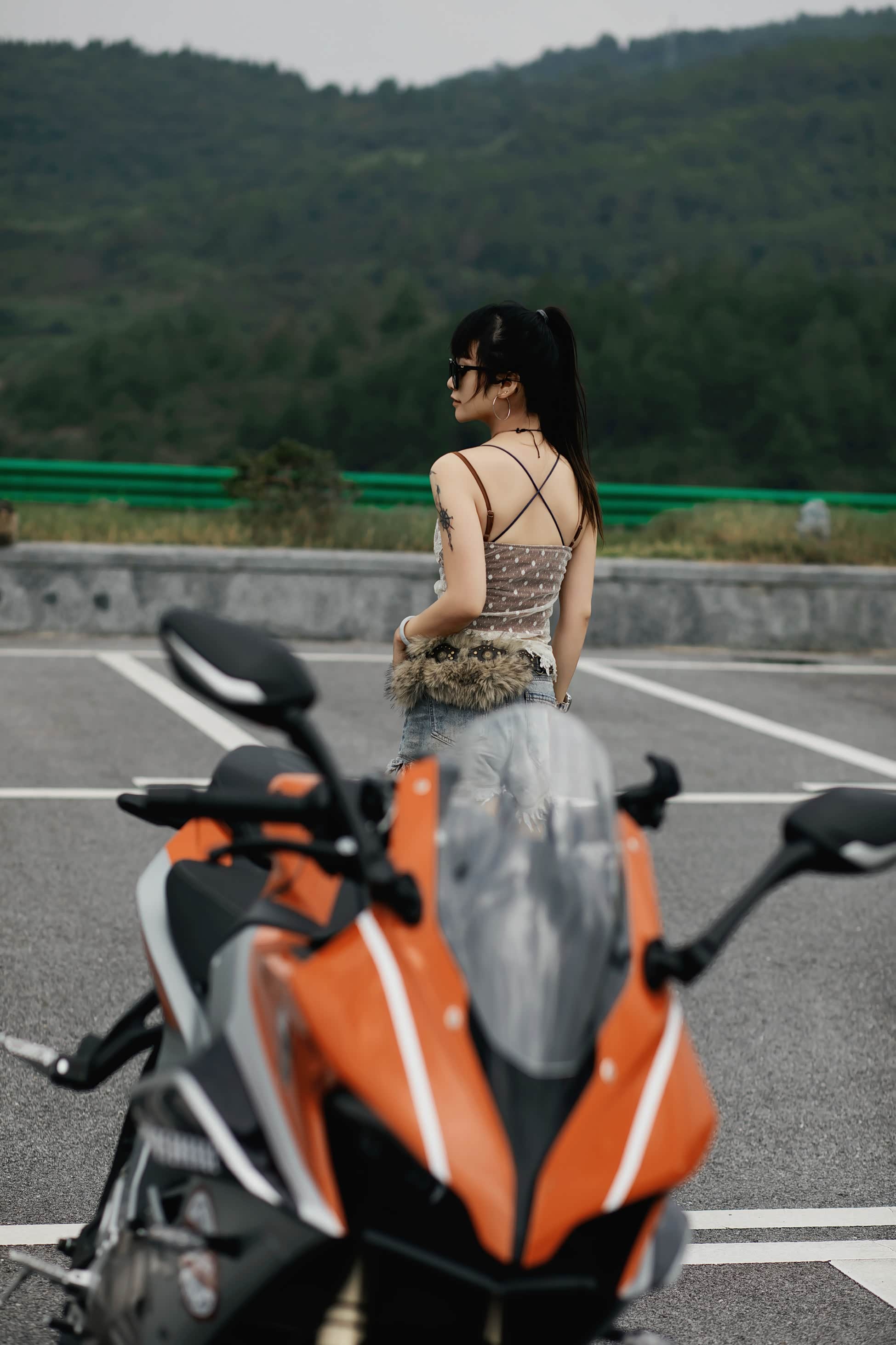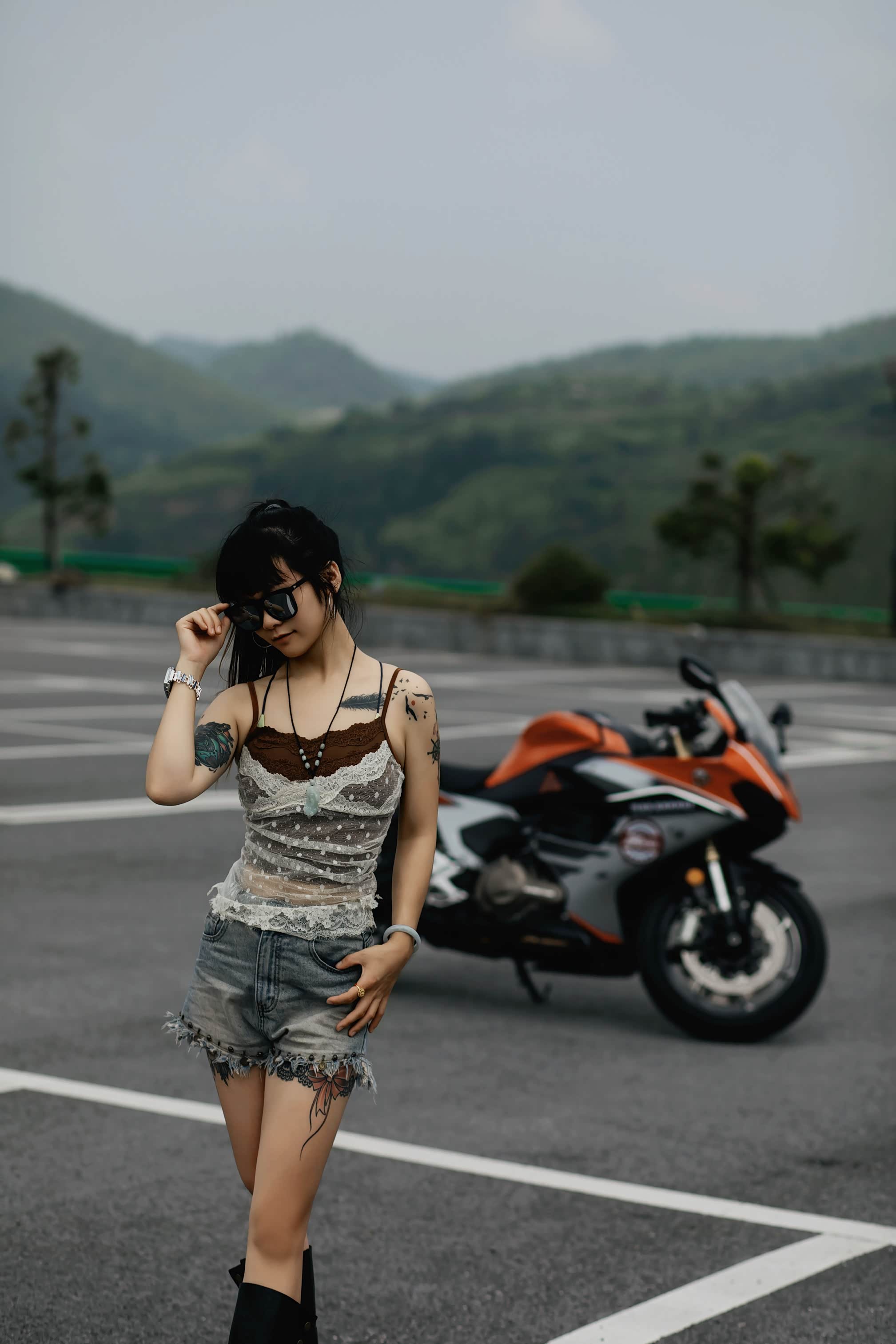 引擎轰鸣撕裂空气,她甩了甩被风掀起的长发,跨上重机的瞬间,红唇勾起的弧度比排气管的热浪更灼人——这不是谁的副驾,是她自己掌控的旷野。