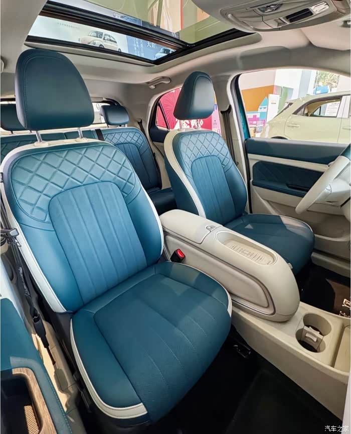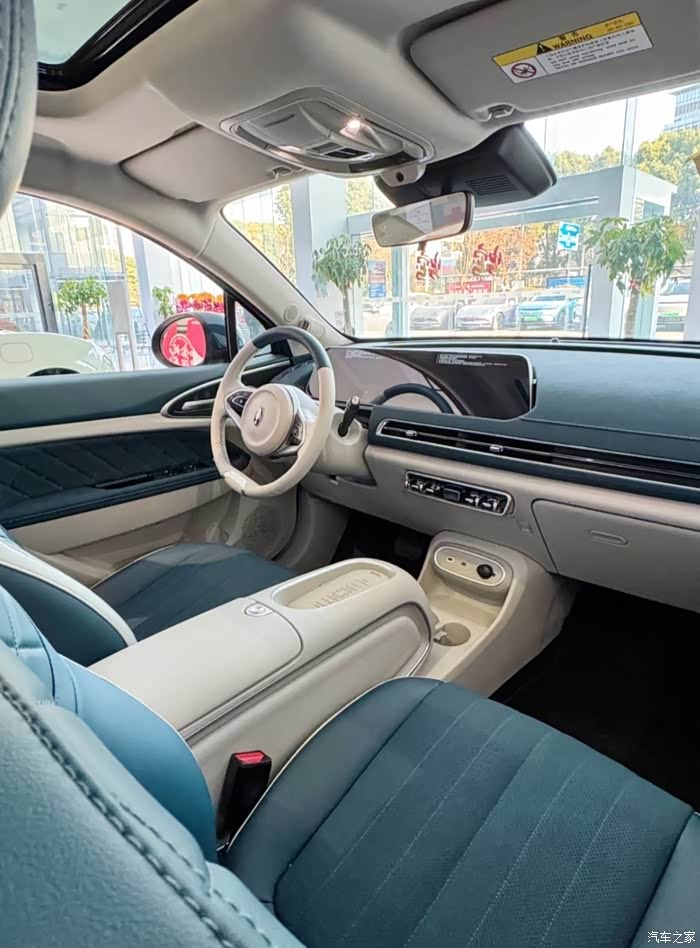 车内部是蓝灰的设计,整体的驾乘空间还不小呢,肯定是够我们一家三口市区内驾乘代步的。销售知道我们家有小孩,还专门提了一嘴后排放安全座椅是很方便的,而且还有儿童锁,安全性还是在线的。