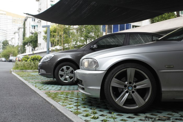 说完了内饰,来说说外观。买来的时候就是18寸轮毂和胎,这对一台4缸2.0的老发动机来说真的是有点吃力了。油耗高一点是必然的(纯市区14个),烧胎、漂移也同样不可能了。6月份第一次去年检没找黄牛,结果轮胎尺寸不过关,无奈回修理厂借了一套E46的原厂16寸的轮毂,顺利过关。话说,好像还是原厂的轮毂好看嘛……