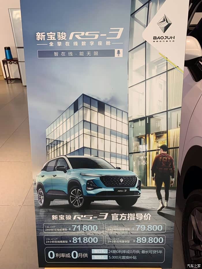 一次偶然的机会我们一家人在一个商场展厅里停放着一辆展车,它的外观一下子吸引了我的眼球,上前询问才知道这是宝骏旗下才新出的宝骏RS-3。本以为这么大气好看的一辆车怎么也得十几万吧,可是走进一看官方指导价也才7万多到8万多元,我的天看第一眼的时候我还以为我看错了,我还找到那里的销售人员问了问确认了一下,在得到肯定的回答后,我心动了,当下在心里就做出了决定我就要买这辆车。