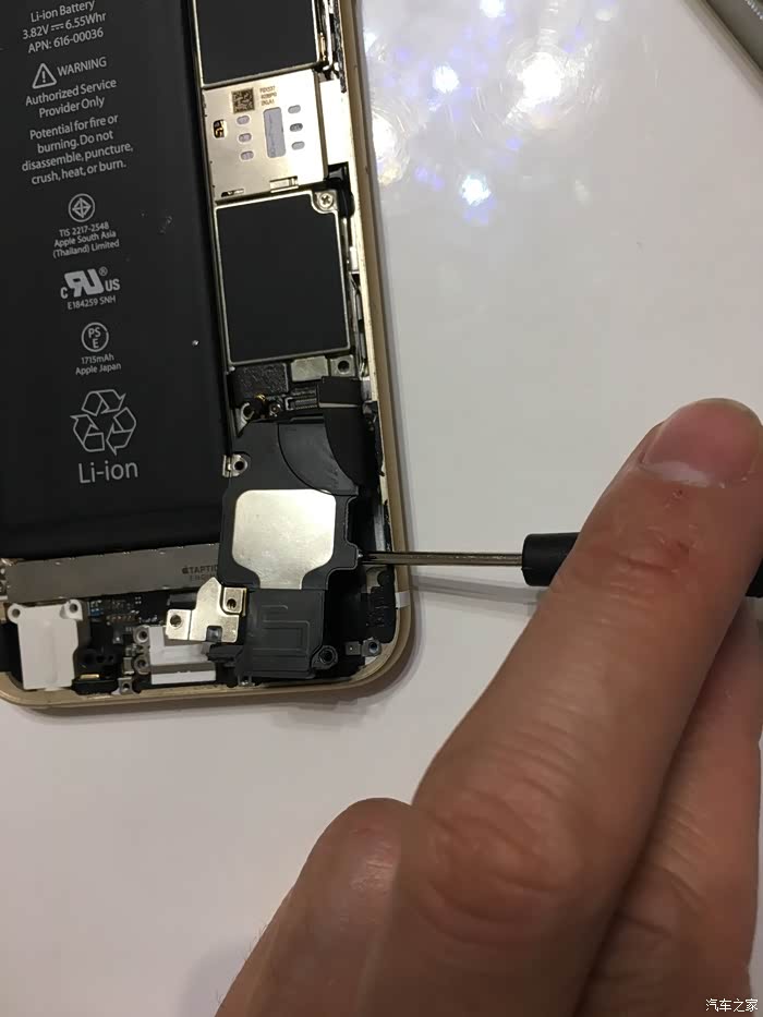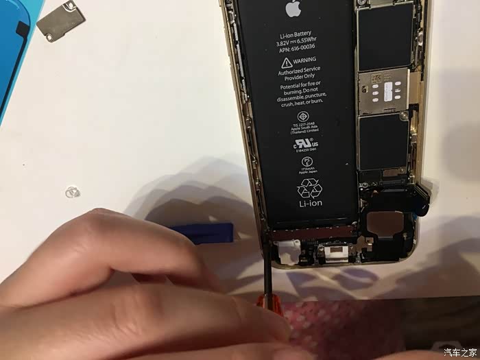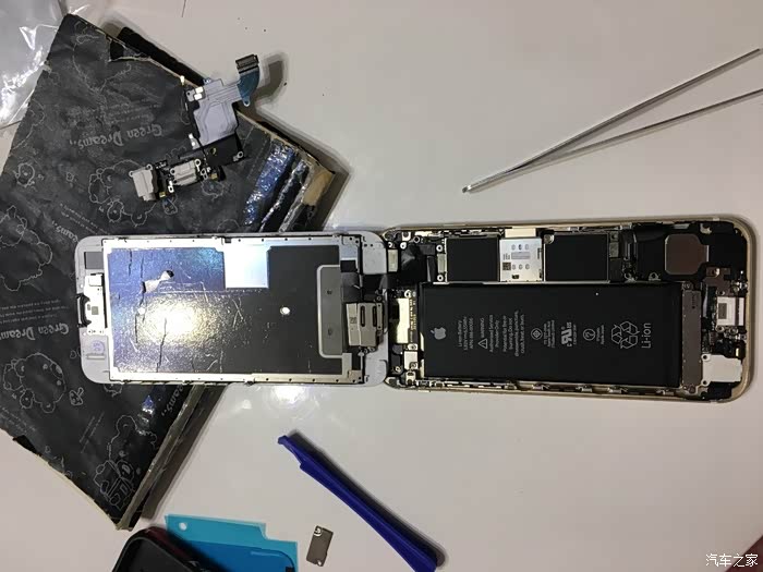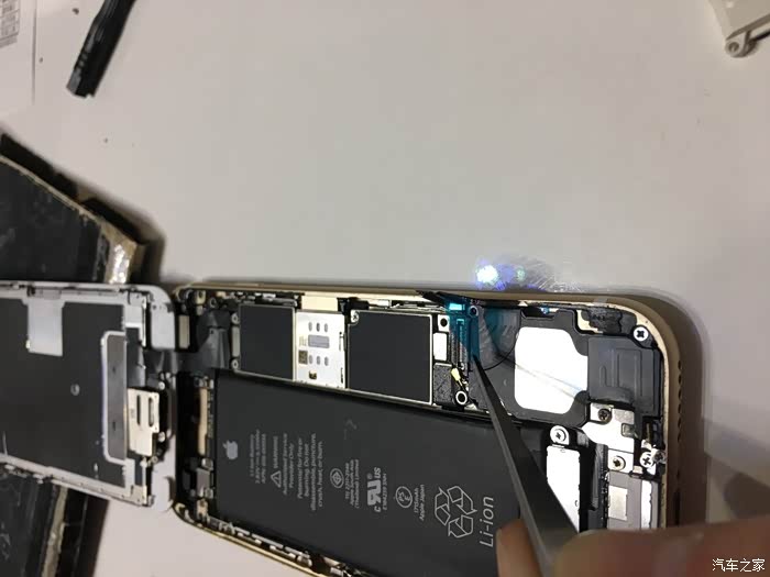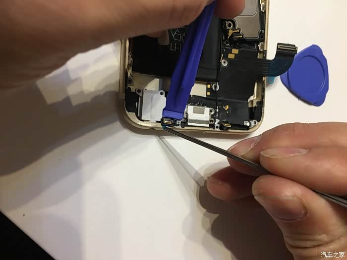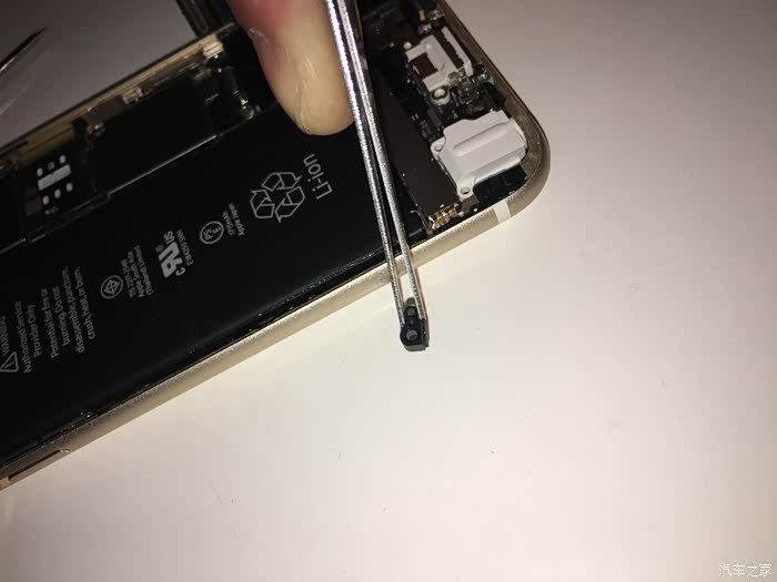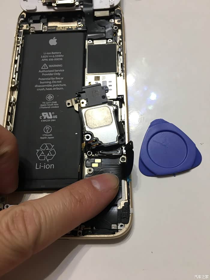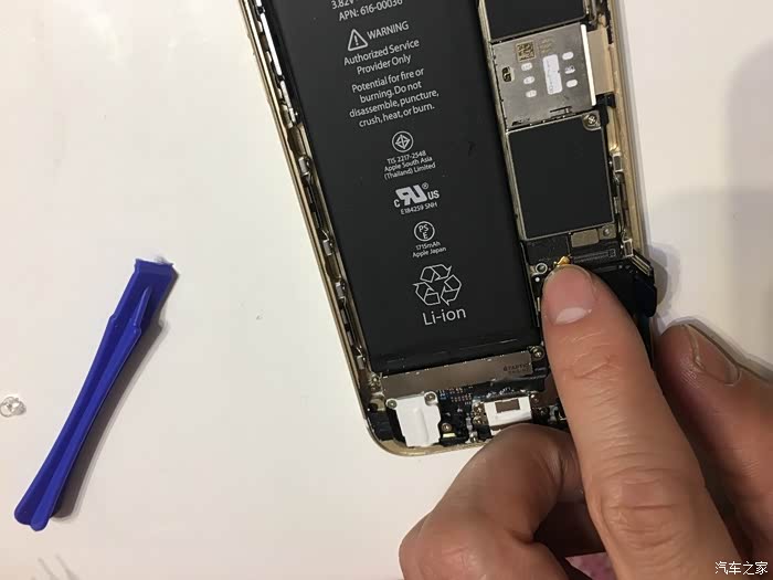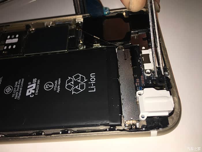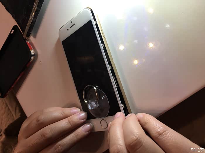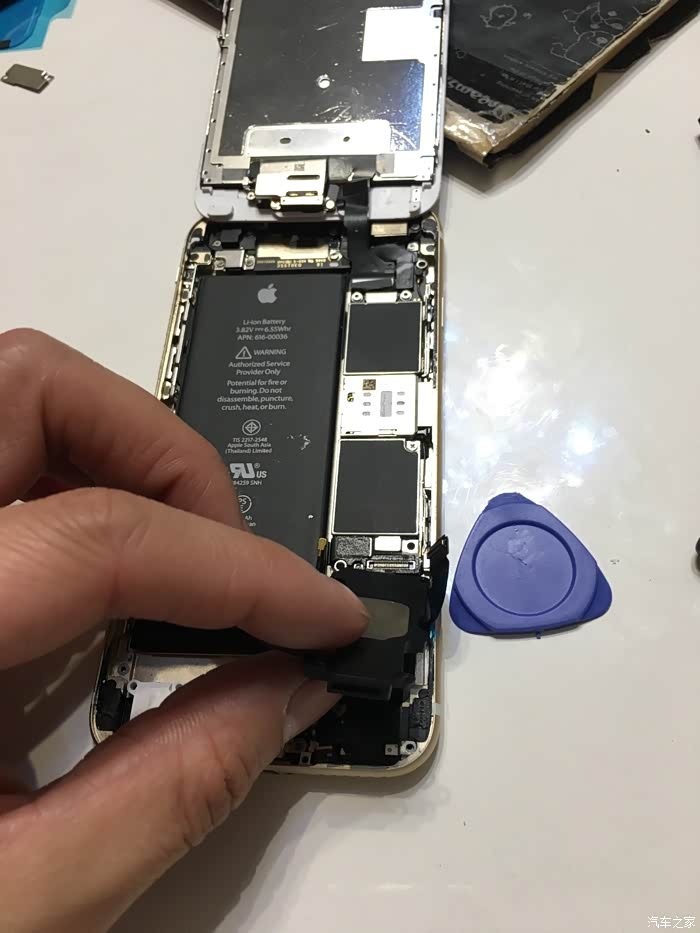 这里需要注意一下,这个6S不需要太注意,我当时的5S的HOME键和主板之间有连接线,如果只用吸盘拉开屏幕,在屏幕脱开的瞬间力量收不住连接线就会被拉断,我的5S就悲剧了,所以一定要用拨片撬!!
