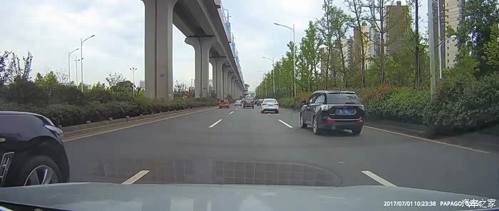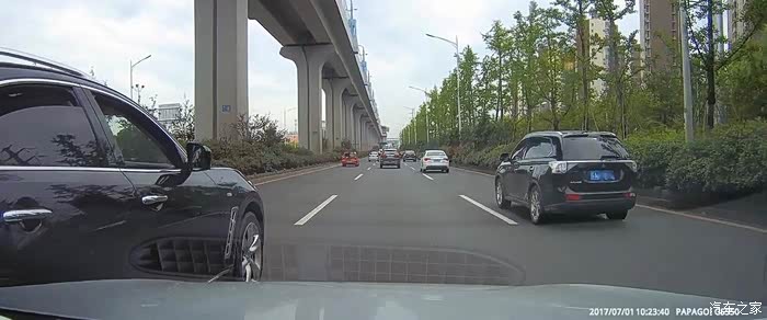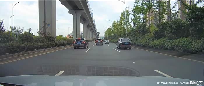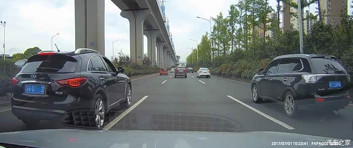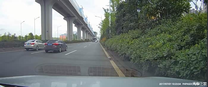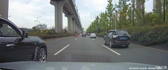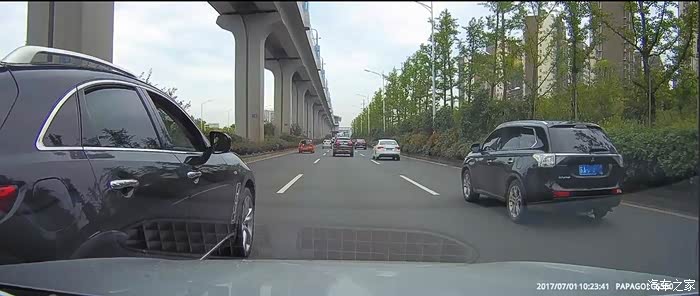 行驶在限速80的郊区快速路上,我的车速即使是80,我也习惯在中间车道或者最右侧车道行驶,将最左侧车道让出来给那些更着急的车行驶。 我的正前方因为一辆红色的高栏货车爬坡,导致车速较慢,这时需要向左右两侧车道变道。当我完成变道到右侧车道时,我前方的黑色FX35变道。我了一下按喇叭提示一下,此时对方刹车并变回中间车道。既然他变回原车道,我就提速超了大货车。也许对方是因为这件事,对方心有不甘。行驶近一分钟后,从最左侧车道超上来,在和我并行时按喇叭并摇下右侧两个车窗,车内两人骂我。然后他就挤到我的车道 碰到我的车左前侧。发生碰擦后对方 立即回到他的车道,踩了刹车但未停车,然后驾车扬长而去。文子在发生碰擦时即可开启了双闪。因为对方已经驾车离开现场,还有快速路上车辆较多,防止后面的车辆发生二次事故,不可能急刹停在路上。为了不影响其他车辆的通行,文子减速并将车挪到右侧车道。此时应该报警,但当时没有记住对方的车牌,为了防止记录仪的视频被覆盖,文子换了一张存储卡。只能等到公司 查看记录仪视频,然后报警。