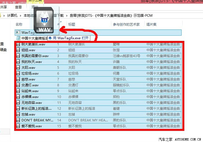 谢谢车友“会游泳的云”使用wavtagfix.exe的最简便方法,就是直接全选wav文件,直接用鼠标拖拽到wavtagfix的图标上就行了!