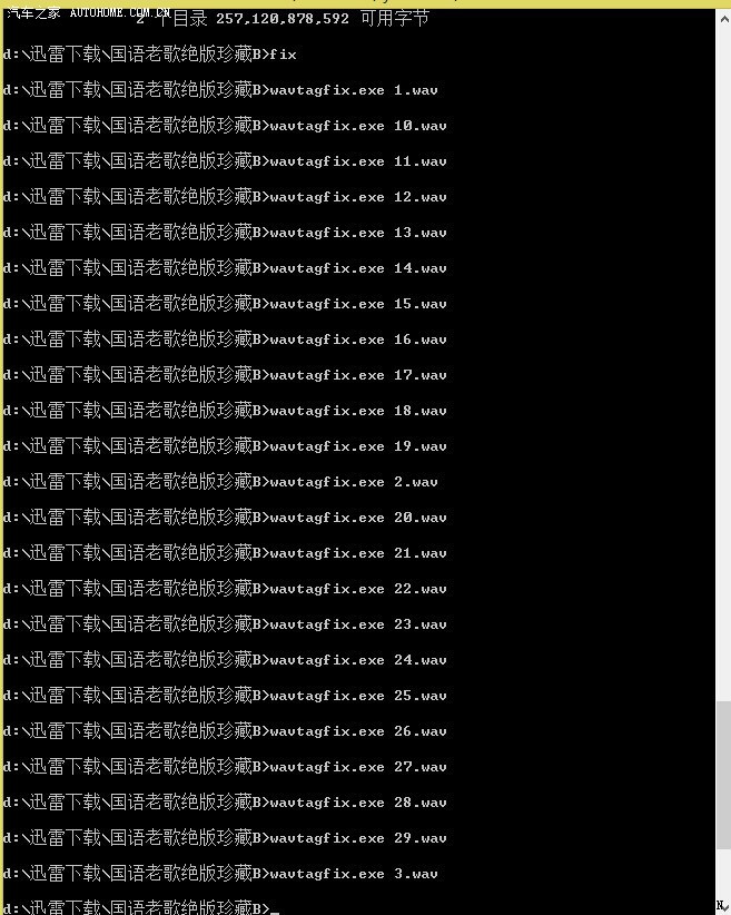 PS:熟悉DOS命令的童鞋可能会问,你为什么不直接用"wavtagfix.exe *.wav"这样不就是全部修改了么?没错,而且我看这个命令的帮助也有这个用法,但是我试过,好像不行,希望大家能看看怎么才能用这个通配符来简化修改的过程!
