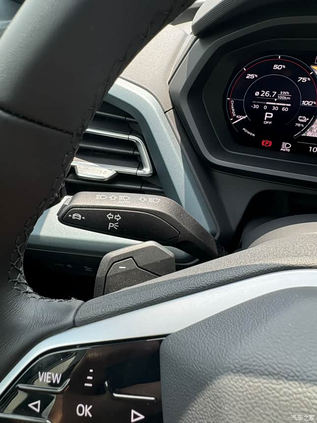 奥迪Q5 e-tron的方向盘还是偏圆形的握感比较粗,方向盘底部没有做成平的显得不够时尚,不太美观。但是北京车展上RS版本的方向盘做了修改,我觉得后期24款也会做一样的设计。