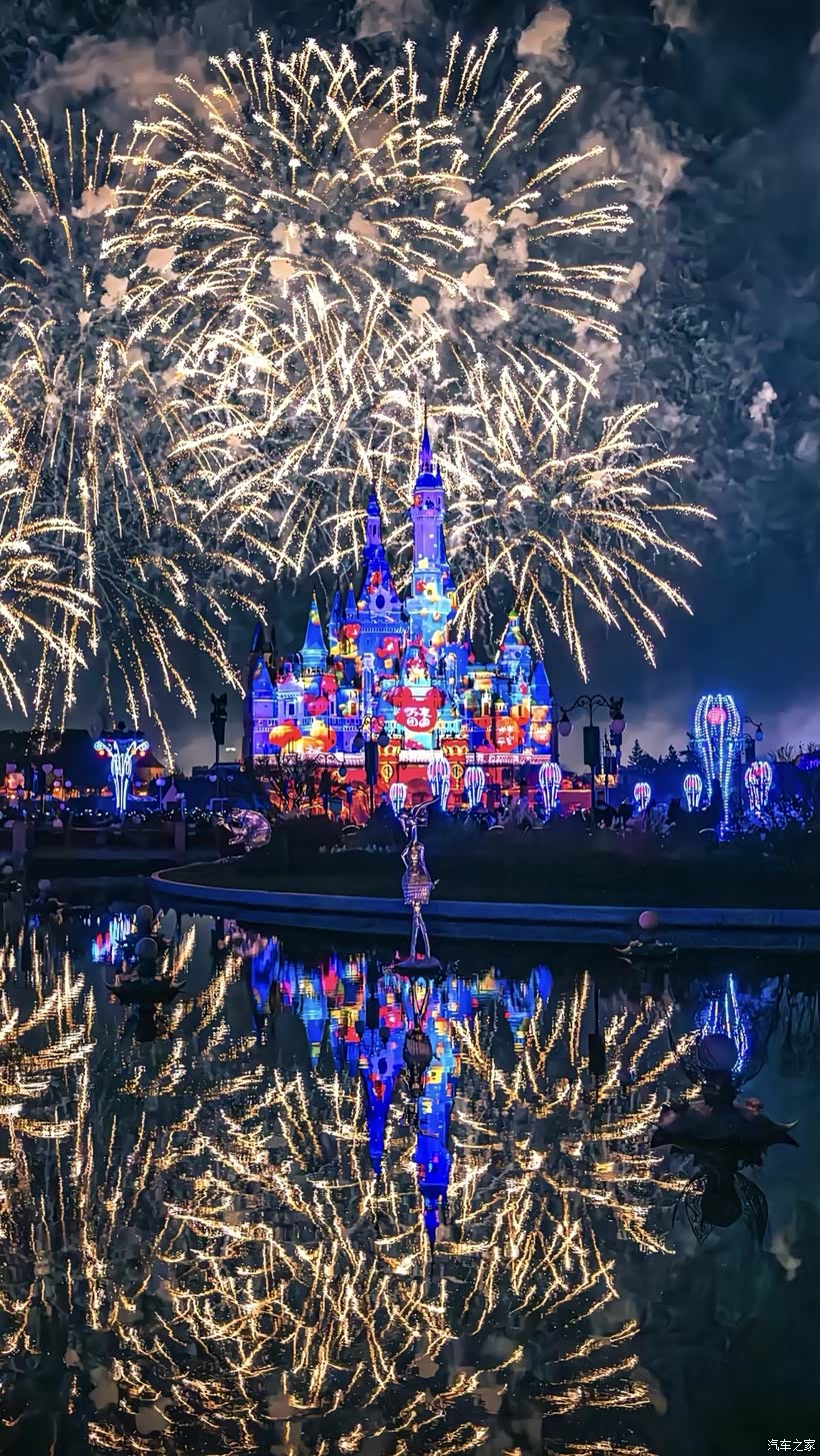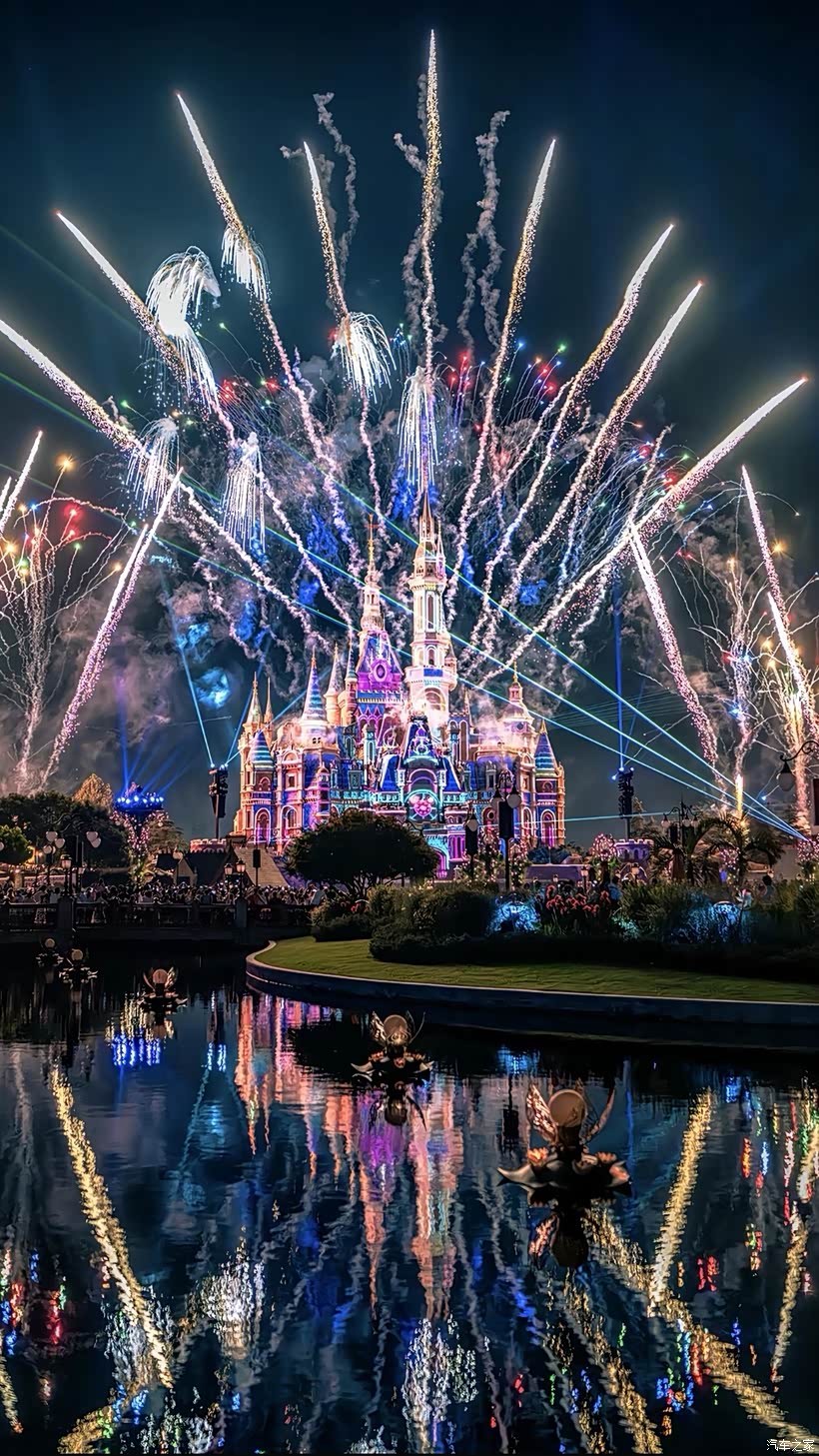 城堡染粉金,烟花如瀑坠,人群举灯围簇,童话高潮在此刻绽放。