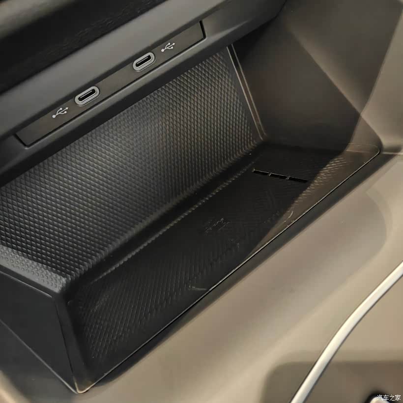 ②前排储物:细碎的储物空间还是不少的,但都不够实用。前排中控台下方有一个手机无线充电位,并带有散热口,这个赞。