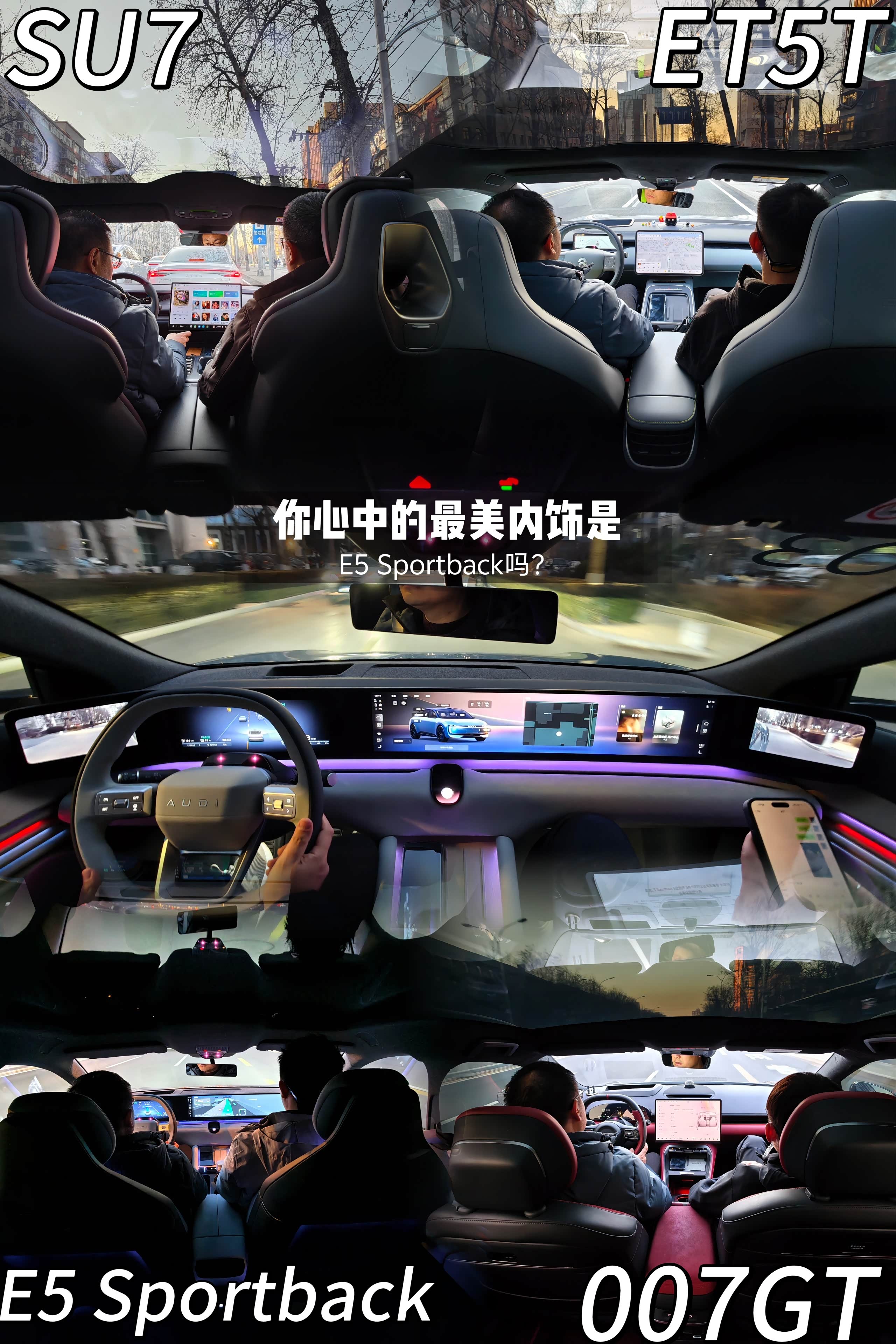 这次试驾的5款车型分别是奥迪E5 Sportback、SU7、ET5T、model3、007GT,我是从内饰设计到驾驶质感再到整车氛围,我更喜欢奥迪E5 Sportback