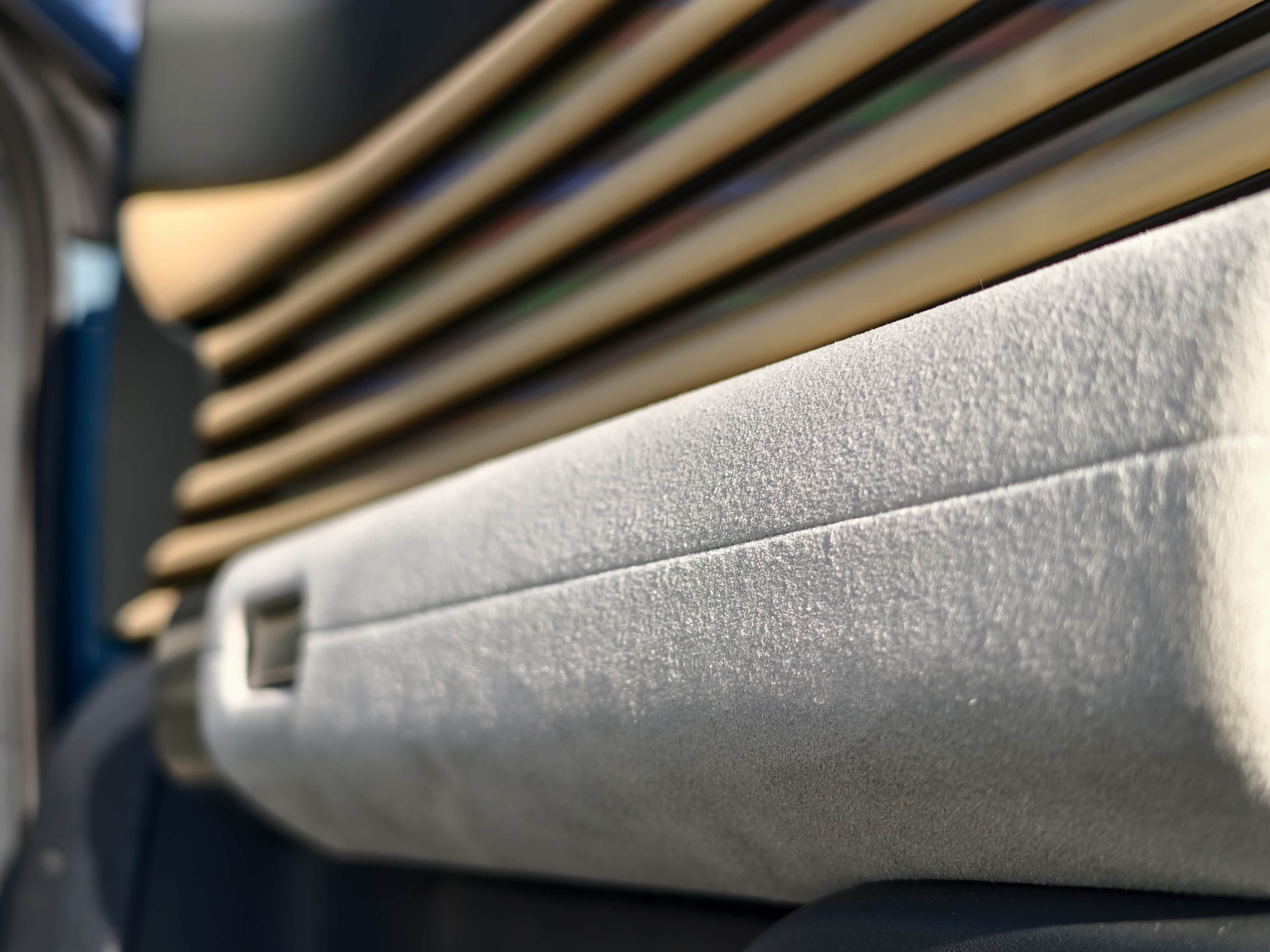车内大部分都是类似这种的高端软质面料,上面还有类似瓦楞雕刻工艺的木板装饰,你喜不喜欢放一边,但是用料是真厚道,源自进口橡木