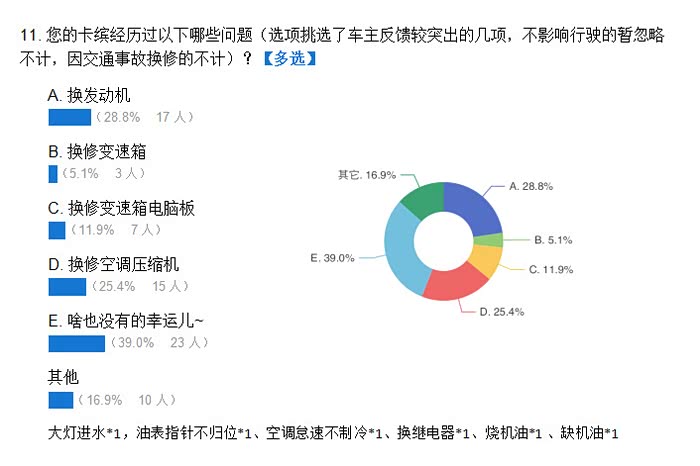 疫情当道,世风日下,与其和负面信息搞思想斗争,不如找点乐子让自己阿Q一点。一日,在卡缤车主群里看有车主玩起了“烧变速箱电脑板故障”的接龙,受到启发,想简单做一个调查问卷了解下卡缤的现状。