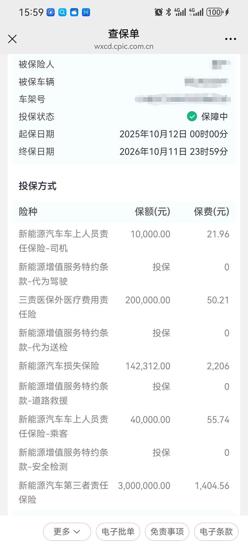 今年九月续保时,我选择了交强险+车损险+300万三者险+座位险的全面保障方案,合计保费4473.02元。对于一款中型纯电车来说,这样的保费水平既覆盖了日常出行可能遇到的风险,又不会给家庭带来过重的经济压力,保障与经济性实现了较好平衡。