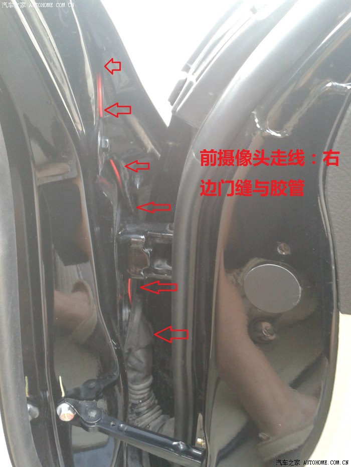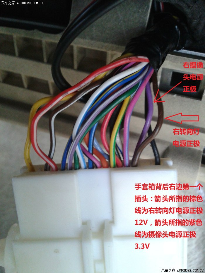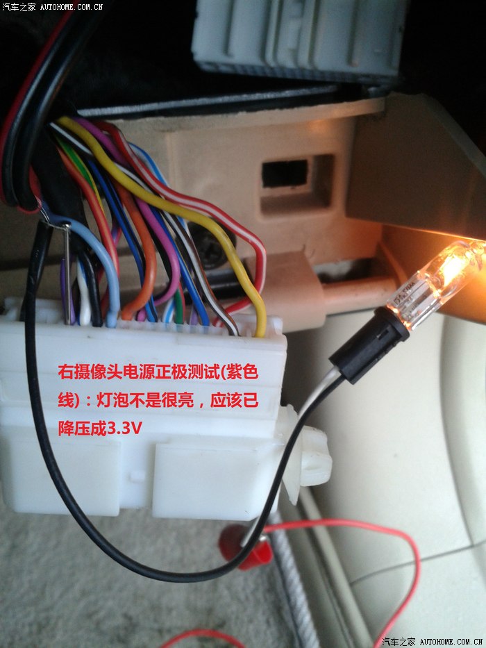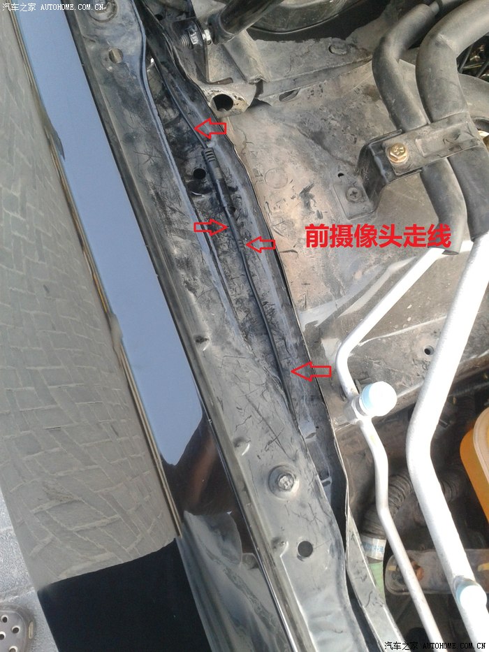 1、安装前摄像头,并测试显示屏的兼容性,切换与夜视效果,搞清接线原理,论证可行性。此已发帖:详见http://club.autohome.com.cn/bbs/thread-c-2091-31280901-1.html?pvareaid=100189。穿线到副驾室走右边门缝及胶管。前、右视频信号暂时用一个二选一开关通过原右摄像头视频输入线(多媒体端)切换输入。