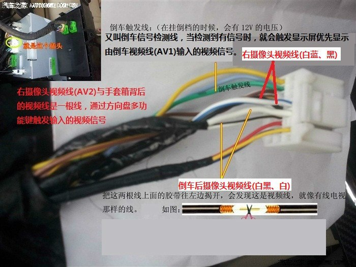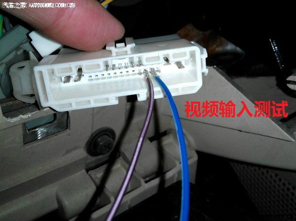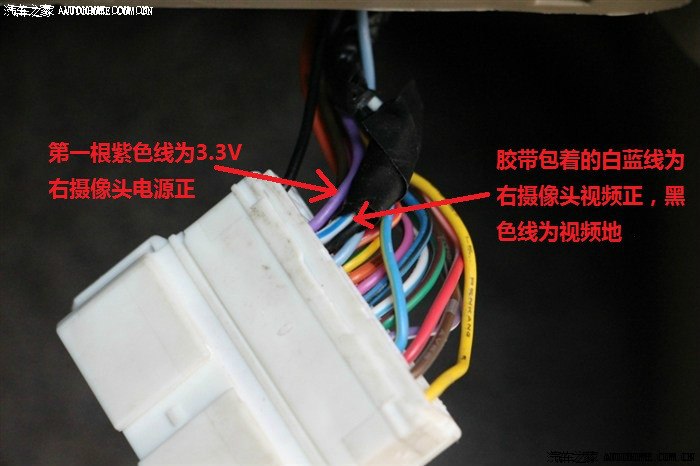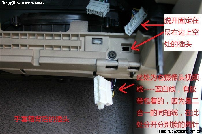 ②接右摄像头视频线:剪断手套箱背后最右边的插头上的白蓝线和黑线,分别连接两个AV端子线,长度能牵到副驾左脚小三角处就行。