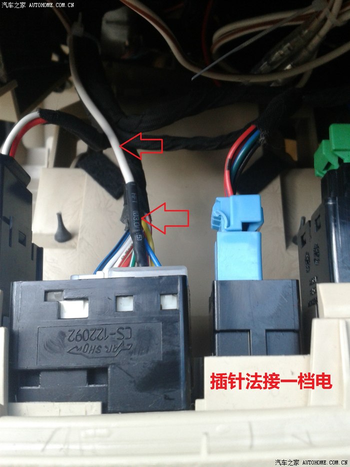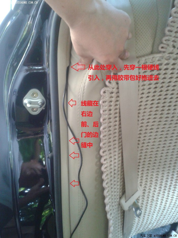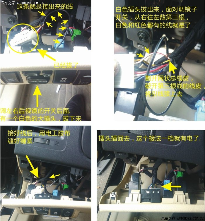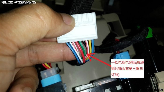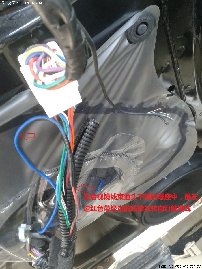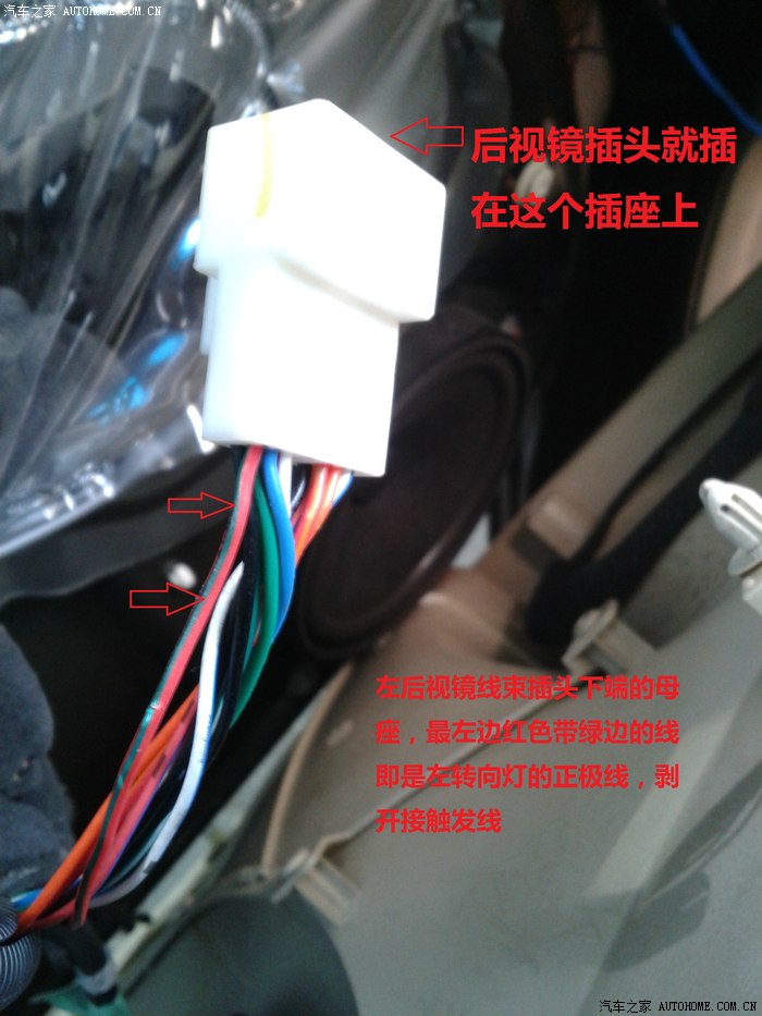 ⑤接左转向灯的正极线作为触发线,左门板内连接左后视镜插头的插座最边上那根红色带绿边的线即为左转向灯的正极线,插针法、剥线法接都可,为防震动松掉,最好剥线接,不要剪线接就不影响原线。也不要接在后视镜插头上,方便以后取左后视镜。