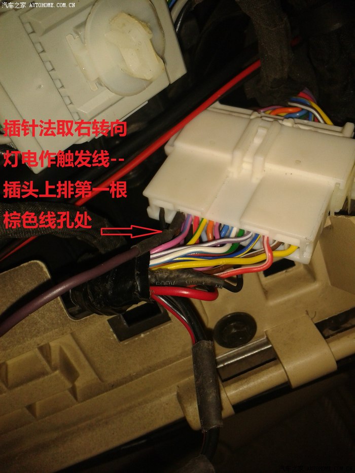 再接右边转向灯正极作为触发线,即该插头最边上那根棕色线,为防破线,可用插针插入即可,再固定好。