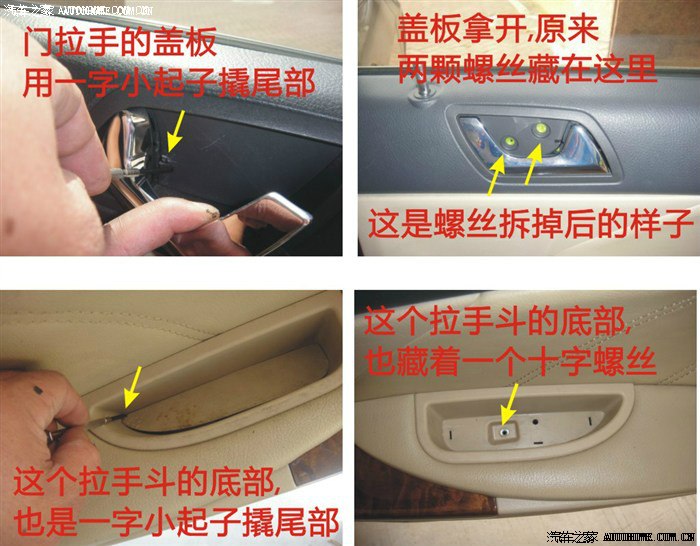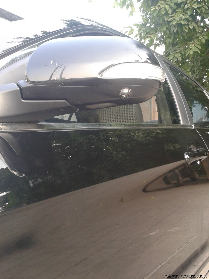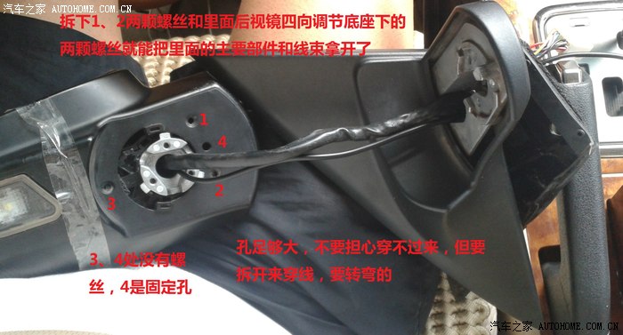 ④安装左摄像头:调镜片左边外翻到最大,方便后面拆镜片。拆门板,可只拆右上角,掰开一点,能取下左后视镜插头就行了,再拆左后视镜小三角及三颗螺丝,取下左后视镜,拆下后视镜折叠处底部的三颗螺丝,将后视镜竖立起来,将镜片往下方压下去一点,用拆车的小钩子将上方的卡子轻轻勾一点起来,就可轻松取下镜片,注意保护好。下面再次借用4副有心杀敌的图。