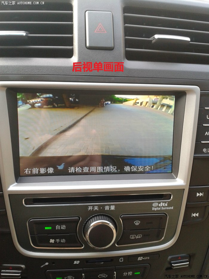 只挂倒档(不打转向灯)出现如下后视单画面,当然不按方向盘多功能键,直接用原车倒车画面还有倒车线和转向随动线。