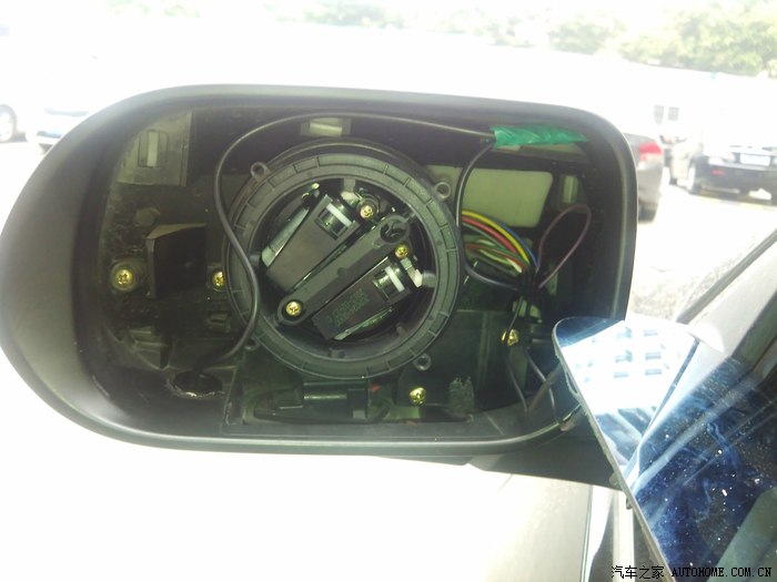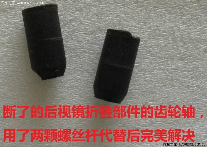 2、在安装左摄像头前在重庆武隆旅游,在那个4星的旅馆地下车库的柱头上将左后视镜碰了,不能折叠了,更加坚定了我一定要拆左后视镜的决心,还好我的动手能力强,猜测一般不是电机故障,而是机械故障,拆开后发现折叠部件的两个小齿轮的轴断了,用了两颗螺丝杆代替完美解决。