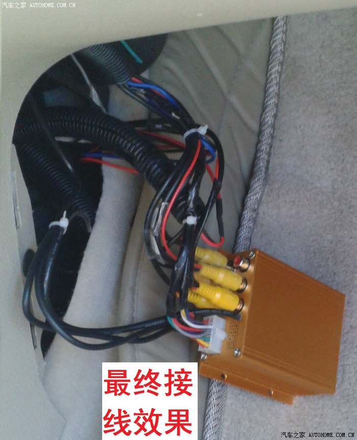 ⑥接视频分割器:原计划将分割器安装在副驾手套箱背后,但空间小了点,也不好固定和查看,所以就选在副驾左脚处小三角处,空间稍大些,但有些热,所以四方线路要用线管穿着,连接线束,所有接头可用热缩管包头,用打火机加热即可,非常美观。