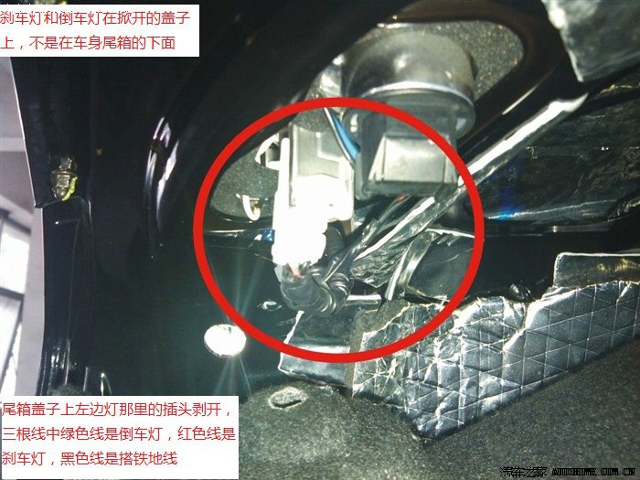 ③取后摄像头视频信号:买摄像头时多买一根6米的视频延长线,从副驾左脚小三角处延地板走线,再延右边前、后门的下方门边线缝,穿线到行李箱,再走线到行李箱盖子的左倒车灯处,分别接后摄像头的视频正和负(黄线正,裸线负),取倒车灯正极(绿线)作为触发线。