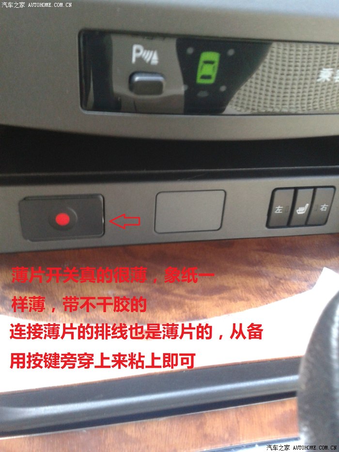 ⑧安装薄片开关,通过烟灰缸下方的空间将线穿上来(加线管很好穿线),贴在座椅加热按钮最左边的备用按键上去就行了。(圆卷中的薄片开关,左摄像头图像角度没调好)