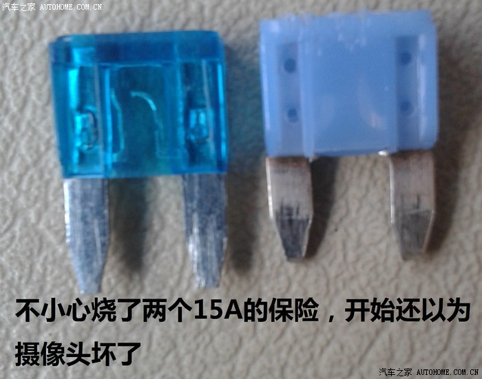 1、测试过程中不知是不小心将常电搭了铁还是将视频的正负极碰了,烧了两个15A的保险,开始还以为是摄像头坏了,后来以为是多媒体烧了,心疼啊,于是想到了……所以提醒要断电接线,测试时包好线头。