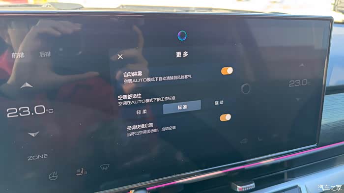 在空调界面的右下角有三个点,点进去,有个“自动除雾”,这个功能可以在自动模式下帮助清除前挡风玻璃上的雾气。