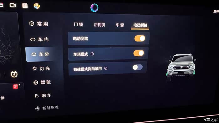 然后是电动脚踏板,正常情况下开门踏板下降,关门踏板就升起,踏板电机升降次数太过频繁,可以在车机里找到车控车设-车外-电动侧踏-车顶模式,这样只有锁车和车辆行驶时踏板才收回,其他时候只要车门开过一次踏板就一直是下降的状态,延长踏板电机寿命。