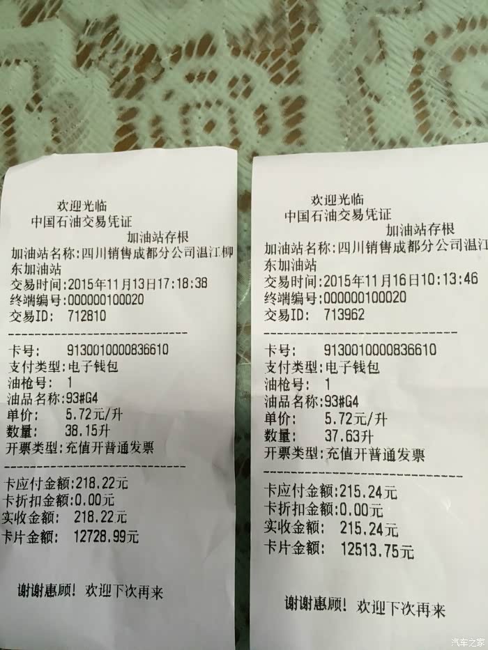 最后传一张出发前后加油的小票图片,可以看出加油站一致、枪号一致。还有就是上面有一个小秘密,就是原来准备用一年的电子钱包,到现在已经一年半了,哈哈,还余一大半。