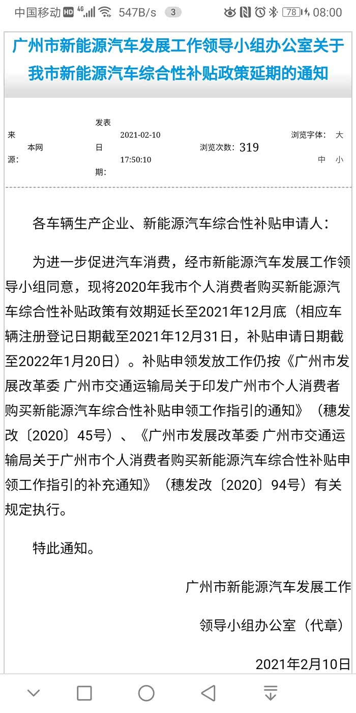 更大的喜讯来了:2月10日,一个好消息在群里传开了,广州发改委发了关于新能源补贴延续到2021年12月的好消息,执着也最终受到了幸运女神的青睐。