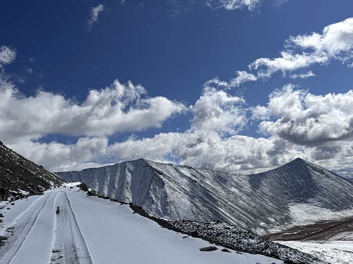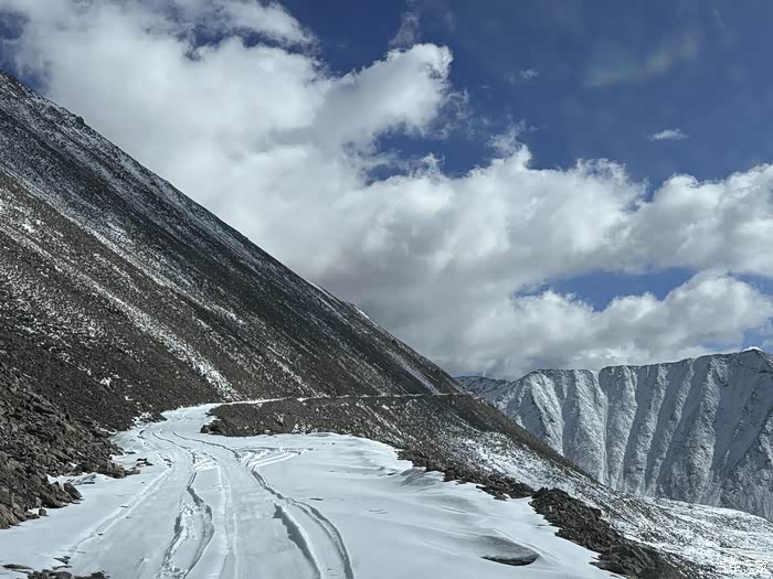 早起轮台出发走216国道直奔胜利达坂,去年天山一号冰川因为修路未能如愿抵达,今年路口处居然无人值守,越过5层“封锁”终于接近胜利达坂,随着海拔的爬升,脚下的雪也逐渐厚了起来,最后在半山腰处为了安全起见决定终止继续爬升,BJ40的公路胎磨损较大,加之冰雪路面附着力差,已经出现打滑现象,担心后面车辆打滑失控就不好玩了,用无人机航拍了老虎嘴位置,路面积雪很大,单车返回是明智的选择