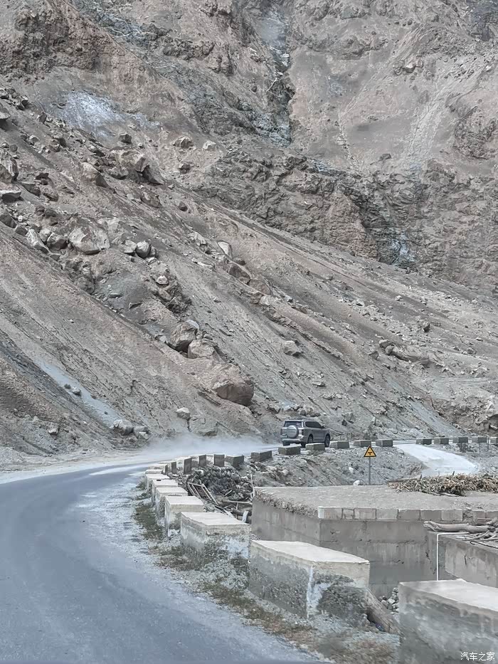 从库祖边境检查站至阿尔塔什1号交通洞,约100公里。此路段手机基本无信号,没有加油站,大多是路况较差的临崖落石路,能看到部分路基坍塌修复过的痕迹。这种地质结构在夏季多雨的时候很容易发生泥石流和滑坡,个人感觉塔莎古道最大的危险来自于落石塌方,在夏季驾驶时需格外谨慎