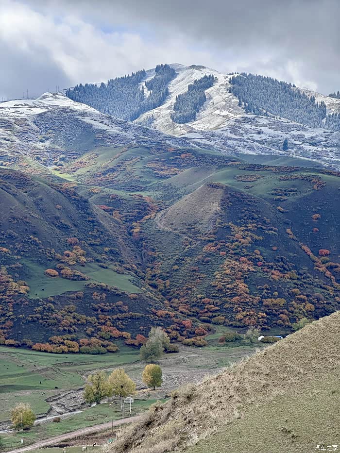 时间关系不能再等,决定绕行315国道倒那拉提,一路上风景很棒!有别于昨天的冰冷雪山,处处是湿润辽阔的草场,水草丰美,群山俊秀。