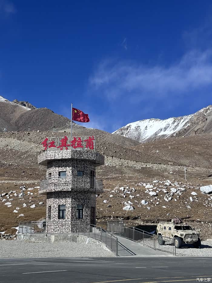 红其拉甫口岸同巴基斯坦毗邻,风光壮美,但由于环境恶劣素有死亡山谷之称。资料记载这里海拔5100米,高山环绕、终年积雪,是中国与巴基斯坦唯一陆路进出境通道,也是世界上海拔最高的国门,年平均气温为零下9摄氏度,最低气温可达零下42摄氏度,氧气含量不足平原的一半,可以想象常年驻守在这里的官兵日常生活的艰辛……当在国门看到飘扬的国旗,那种自豪感油然而生!