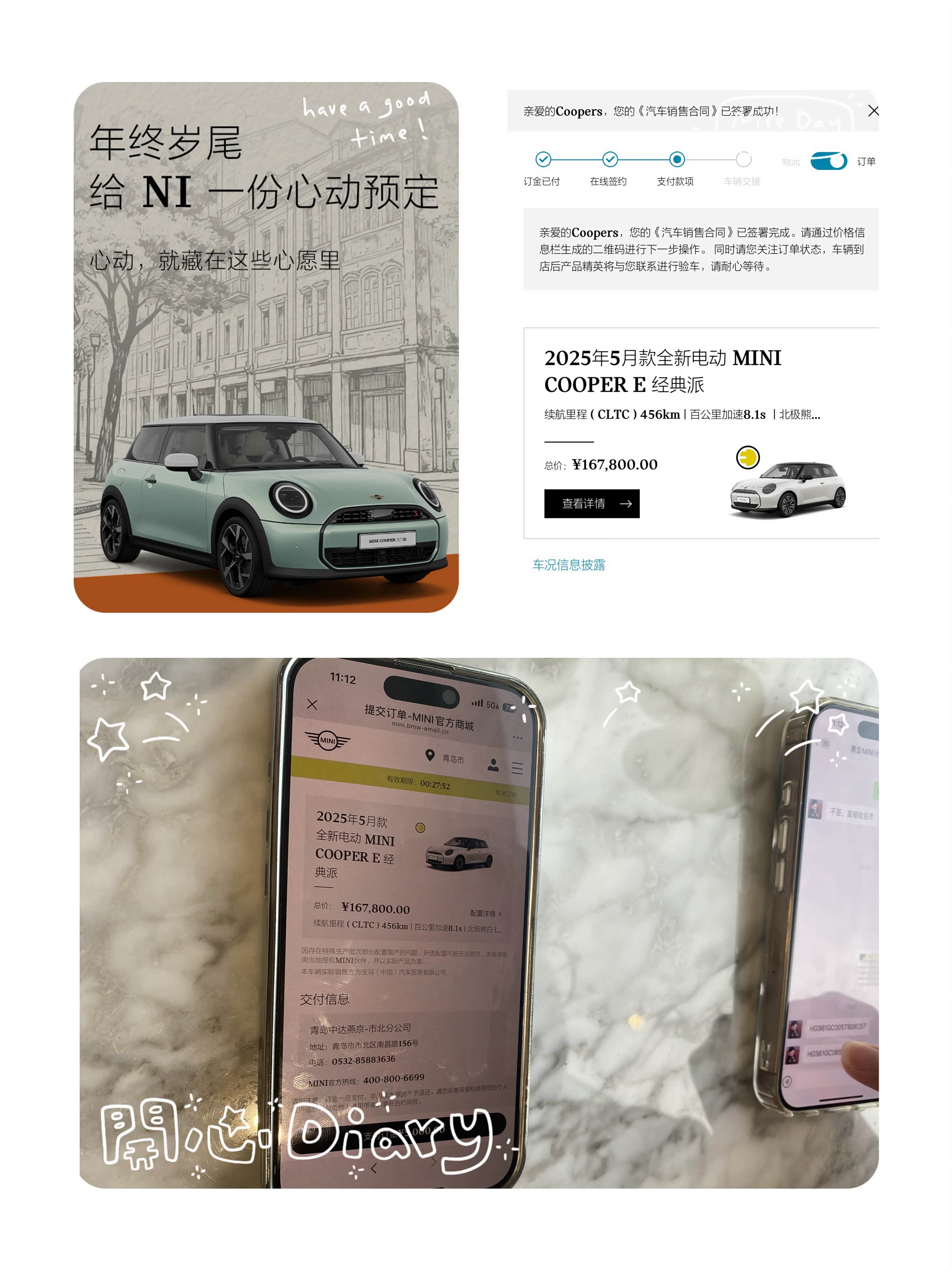 一开始女儿对特斯拉挺感兴趣,约好了周六去看车试驾;然后缘分所致,刚好她闺蜜在宝马车行做售后,随口提了句电动MINI现在降价,一口价才14.88万,我们之前压根没关注过,一听MINI竟然这么便宜了?赶紧搜了下,女儿当天就兴奋地约了周日去看车试驾,哈哈,这看车试驾行程直接排满。