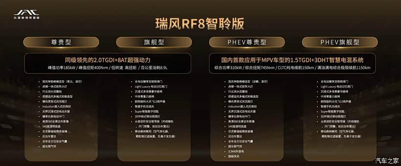 就拿瑞风发布的RF8来说,21.99w就能上到PHEV的车型,相比燃油RF8不过也只差了3w,动力能多出125KW的功率和375扭米的动力,驾驶起来会更加平顺和舒适。